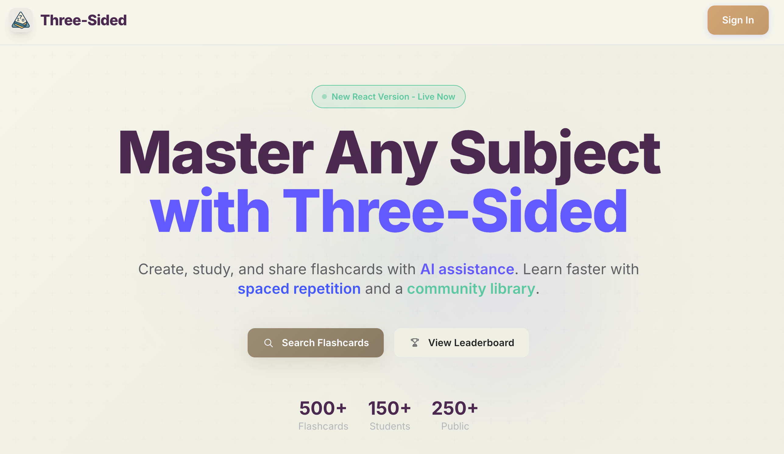 Three-Sided是一款社区Flashcard Web应用,通过添加第三面提示,帮助用户建立理解,提升学习效果,而不仅仅是死记硬背。