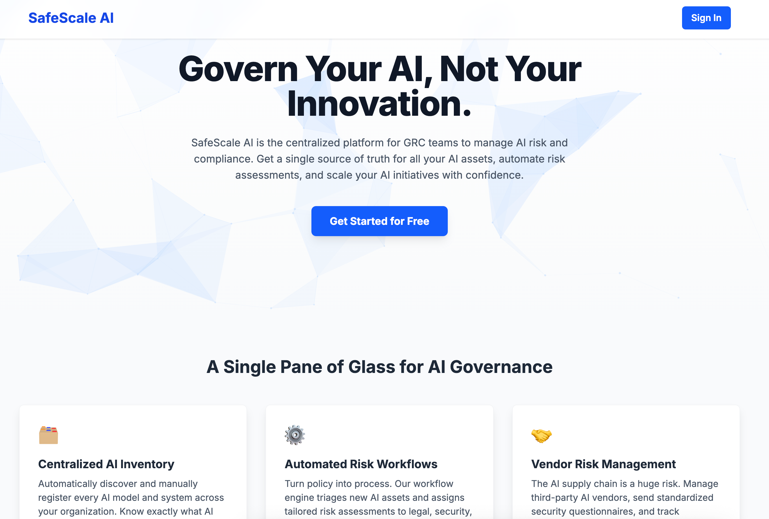 SafeScale是一款AI GRC平台,帮助企业和个人集中管理AI资产,提供清单、仪表盘、供应商和设置页面。