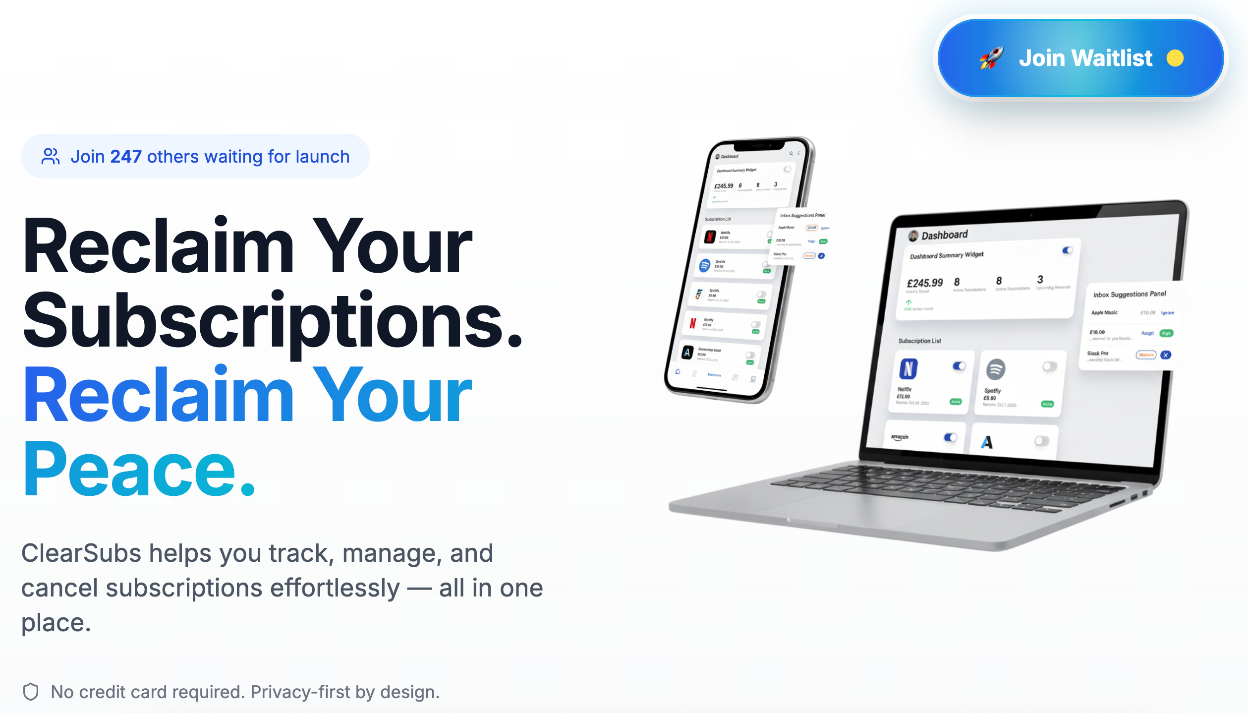 ClearSubs是一款隐私至上的订阅管理工具,自动扫描邮件和银行账单,帮助用户查找并取消被遗忘的订阅,从而节省开支。