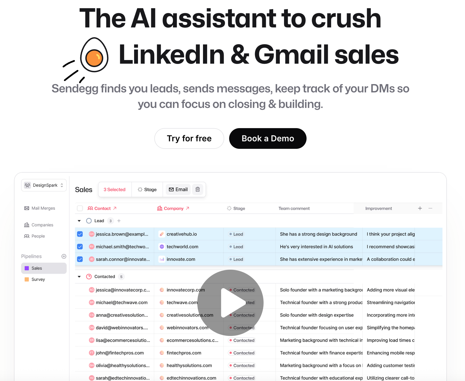 Sendegg是一款LinkedIn销售拓展工具,通过提取互动者、过滤竞争对手和无关角色,利用AI缩小到特定目标客户,从而提高获取温暖潜在客户的效率。