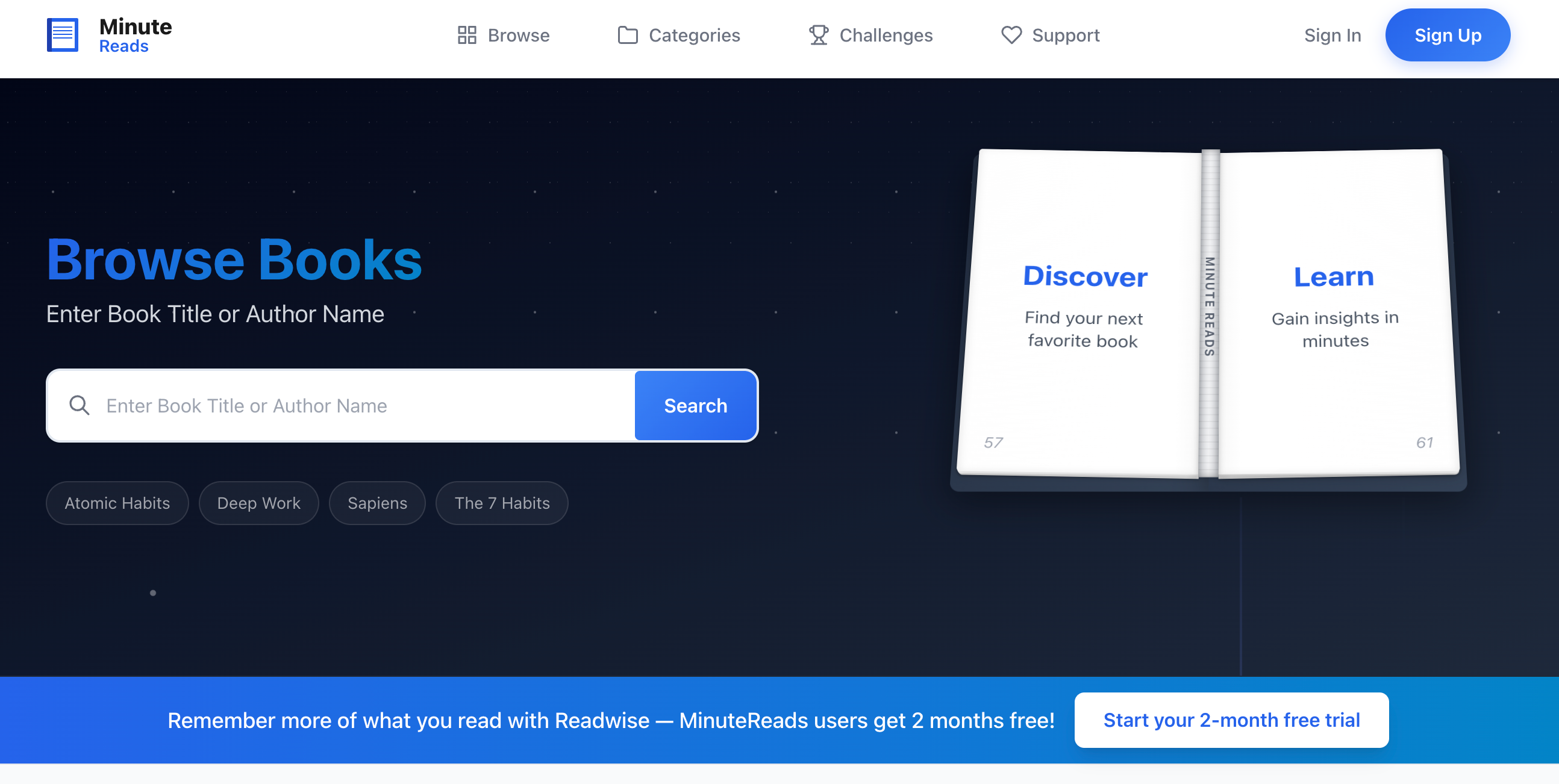 Minutereads是一款免费书籍概要网站,提供超过22万本书的3、6和10分钟概要,支持21种语言翻译,并具备高亮、笔记、书签和PDF导出功能。