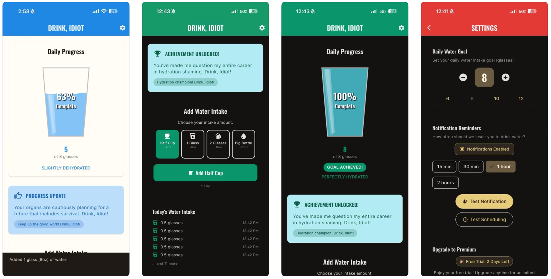 Drink, Idiot是一款 hydration reminder 应用,通过发送羞辱性通知来提醒用户保持水分。