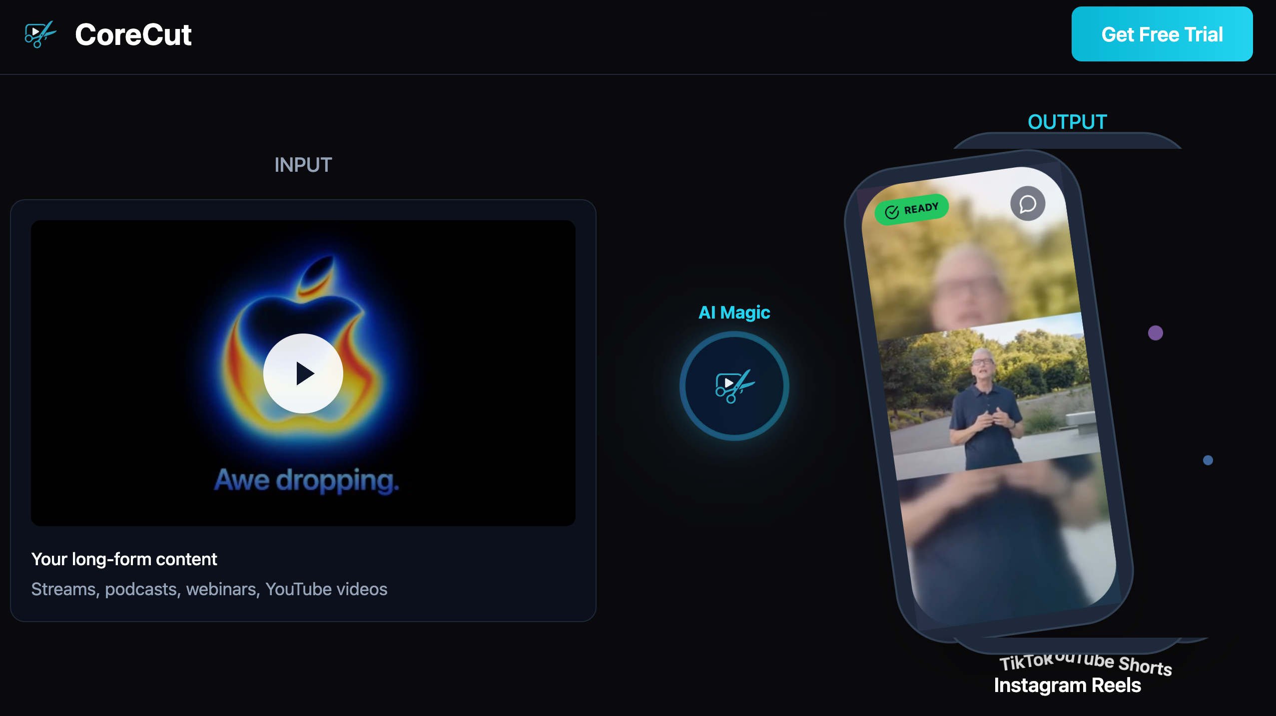 CoraCut是一款AI SaaS工具,能够将长视频快速转换为15-60秒的短视频片段,效率高且便于分享。