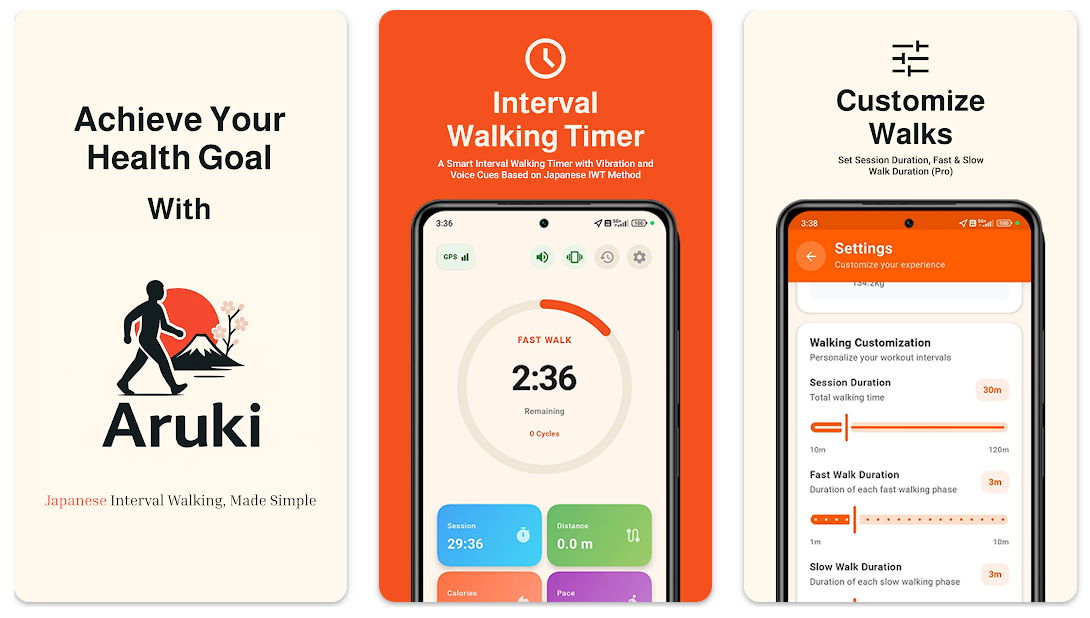 Aruki是一款免费的安卓应用,帮助用户进行日本间歇步行,追踪步频和记录进程,以更有效地燃烧卡路里并提高耐力。