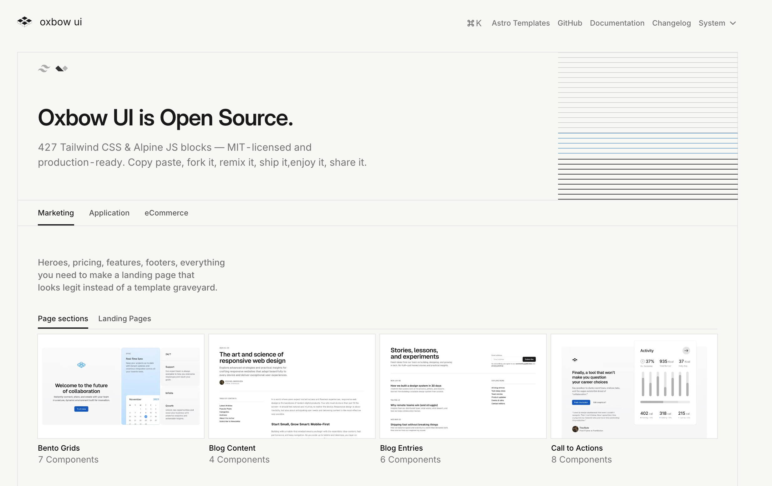 Oxbow UI是一款基于Tailwind CSS和Alpine JS的UI库,包含427个免费使用的组件和模块。