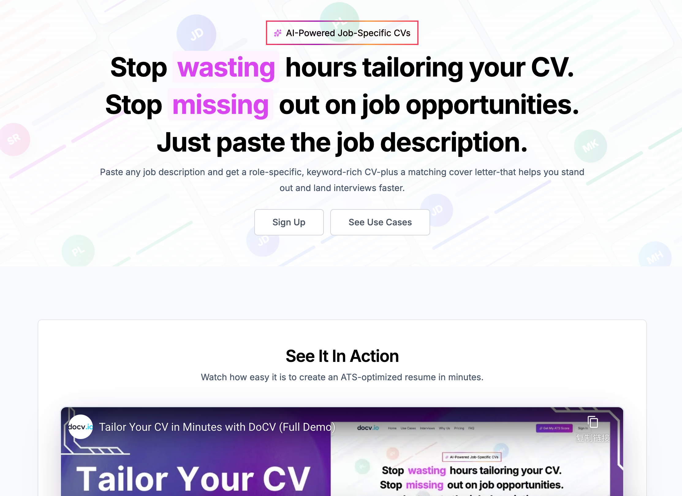 DoCV是一款AI简历和求职信生成工具,根据职位描述定制简历,提供ATS评分、职位匹配分析和技能缺口清单,帮助用户更快申请工作。