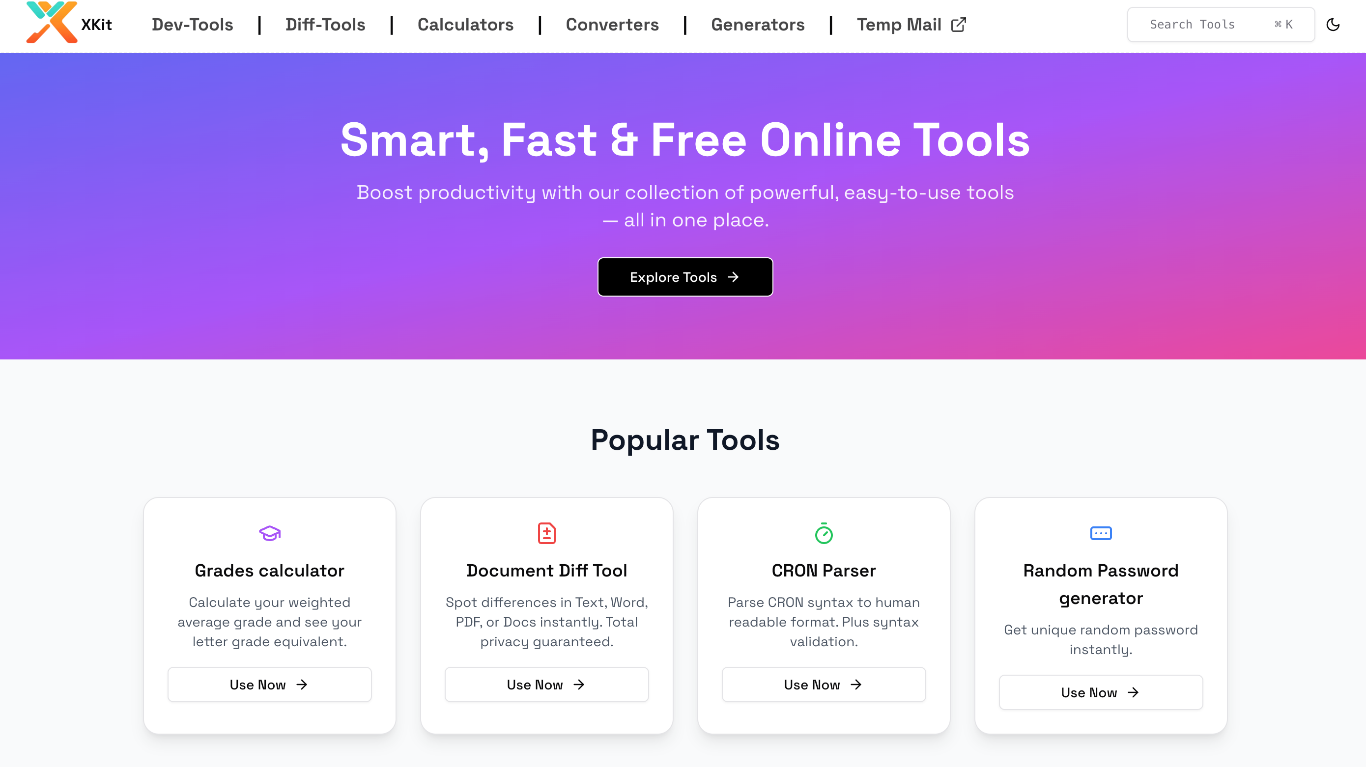 XKIT是一款免费在线工具应用,提供多种实用工具如开发者工具、Diff工具、计算器和转换器,100%免费且无需登录,支持移动和桌面设备。