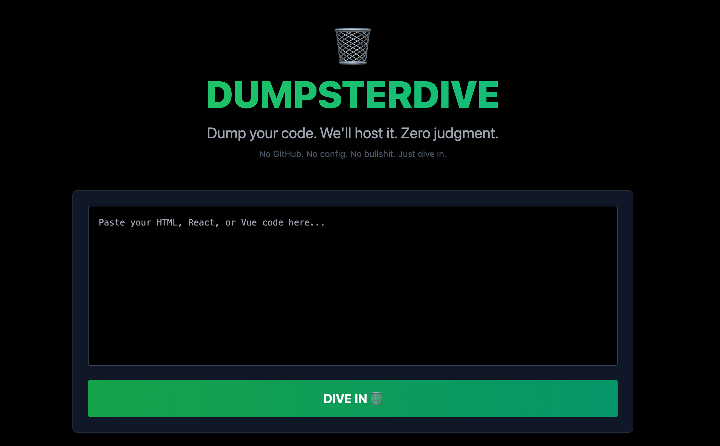 Dumpsterdive是一款AI代码托管工具,用户可以在几秒钟内快速获取托管链接,无需繁琐的GitHub配置。