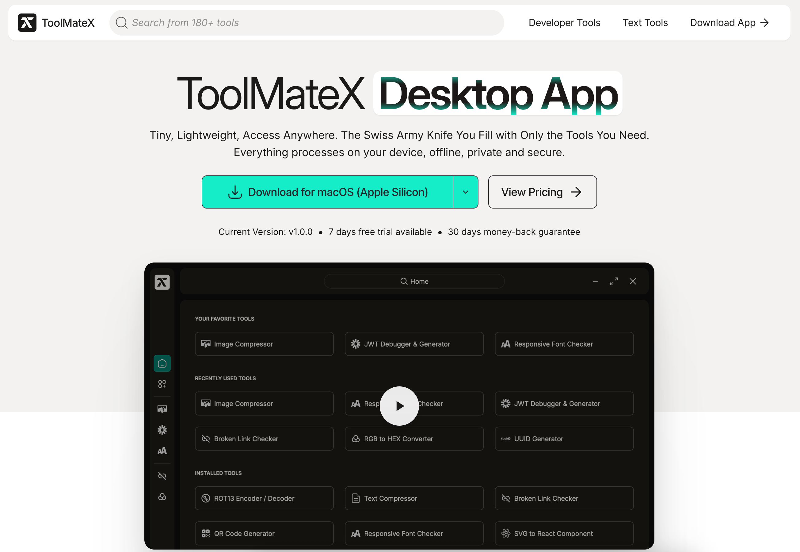 Toolmatex是一款桌面应用,为开发者、设计师、数据工作者和内容创作者提供多种实用工具,用户可离线安装和使用,确保安全和便捷。