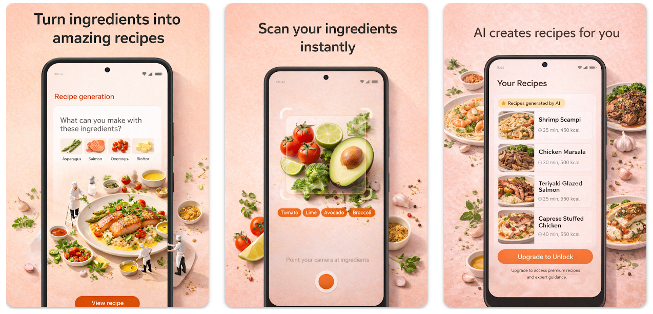 AI Chef是一款用相机扫描食材并用AI生成可烹饪食谱的手机应用,支持收藏保存。