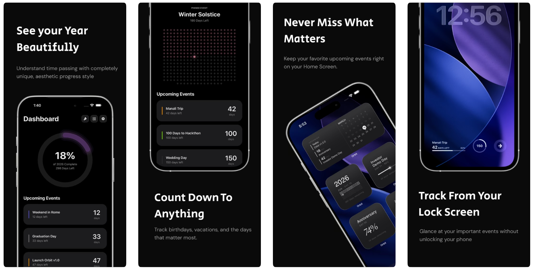 Orbit是一款独立开发的极简时间与倒计时追踪应用,可显示年、月、周进度并记录重要事件。