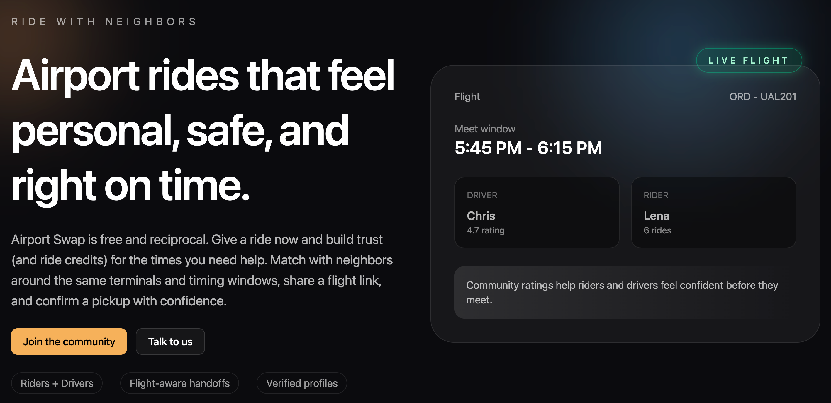 Airport Swap是一个免费的机场拼车交换平台,帮助邻里和社区互助安排接送机。