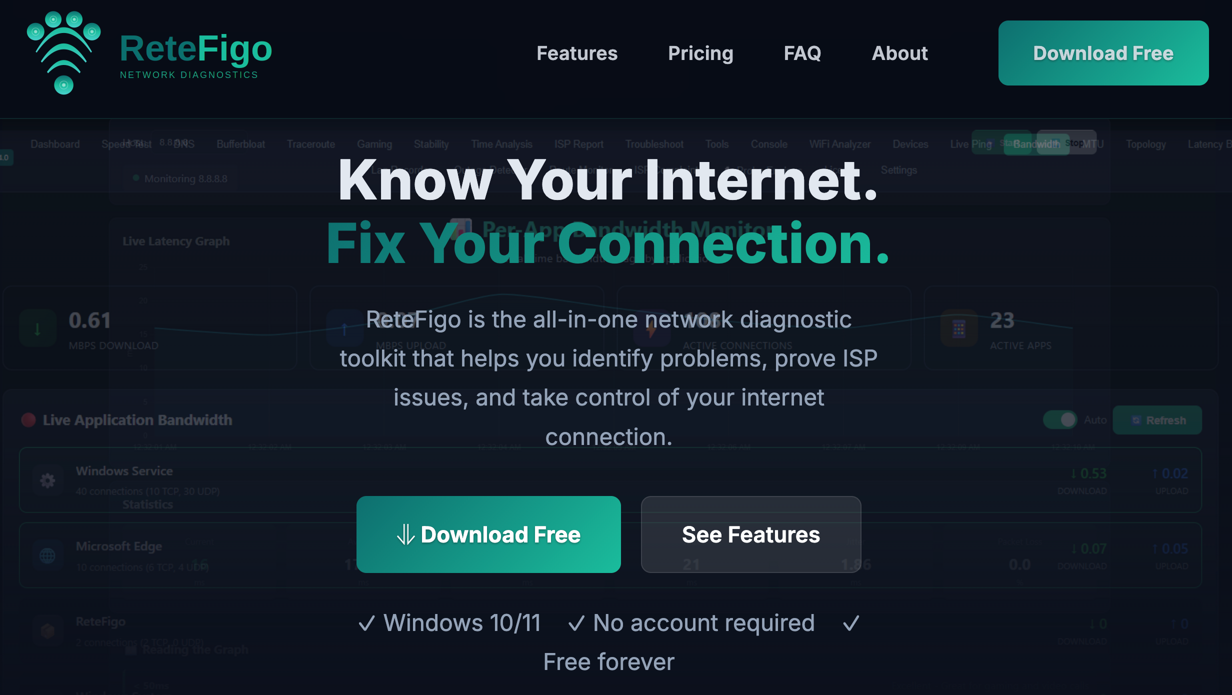 ReteFigo是一个网络监控与诊断工具,支持实时检测并生成可用于向ISP申诉的报告。