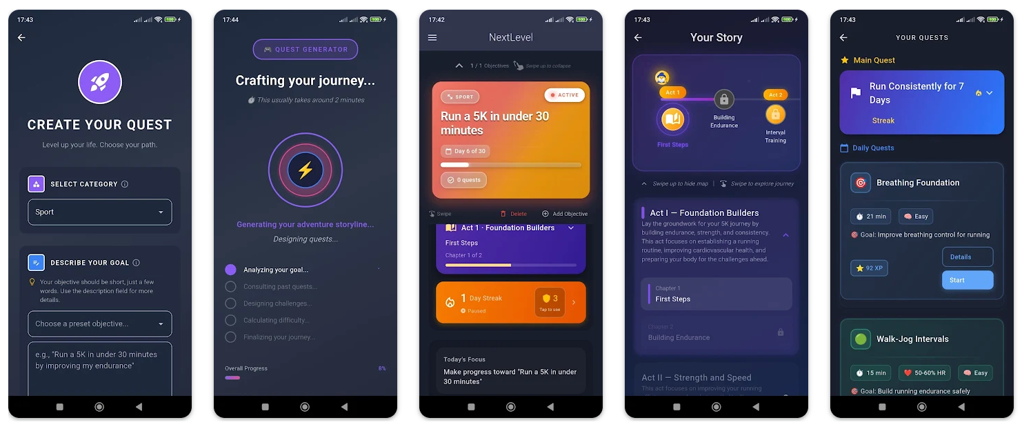 NextLevel是一款将长期目标游戏化的安卓应用,可自动生成每日任务并通过章节、经验和奖励激励进度。