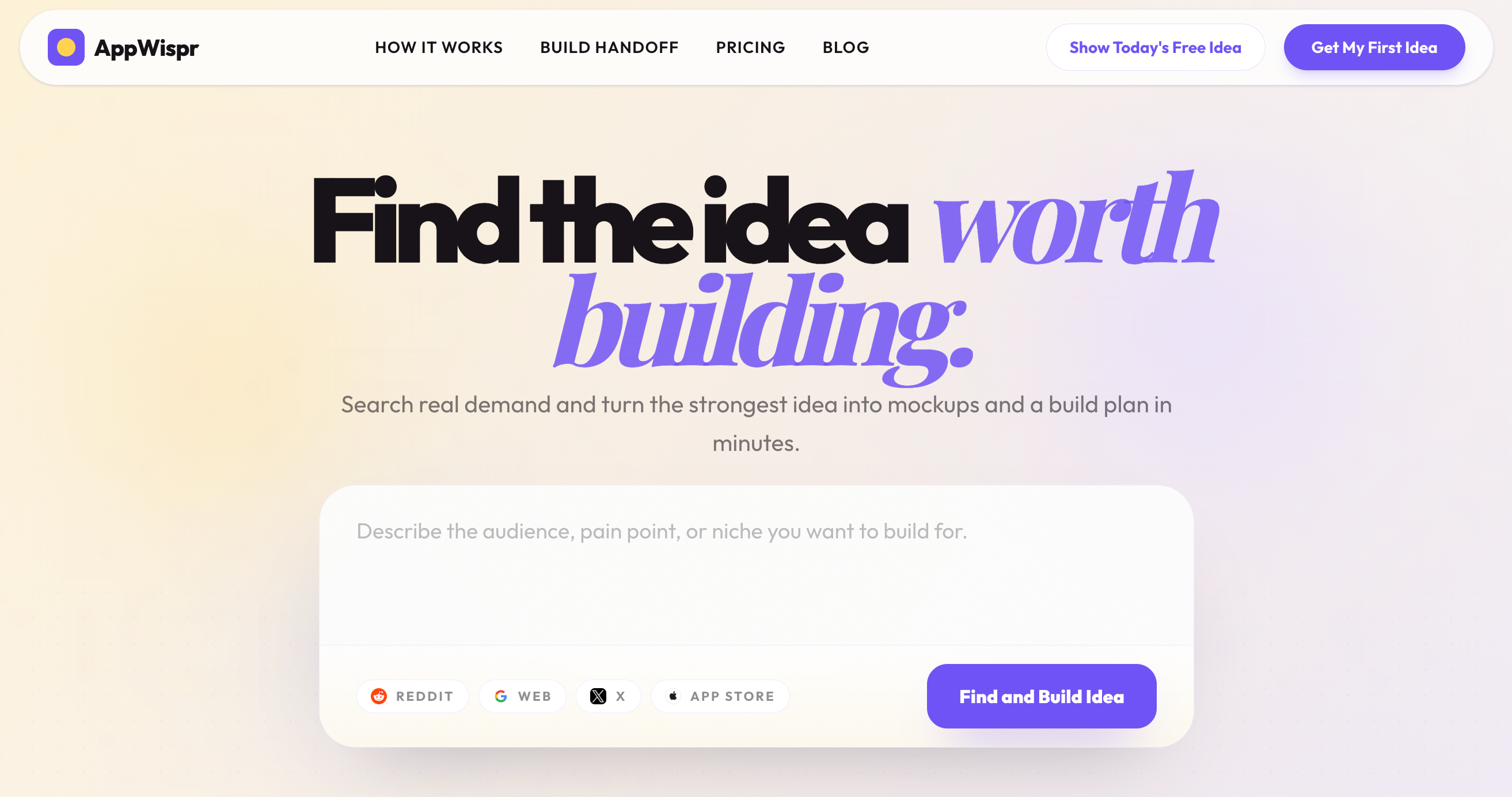 AppWispr是一款产品创意挖掘工具,可从网络讨论中提炼应用点子并生成原型与构建方案。
