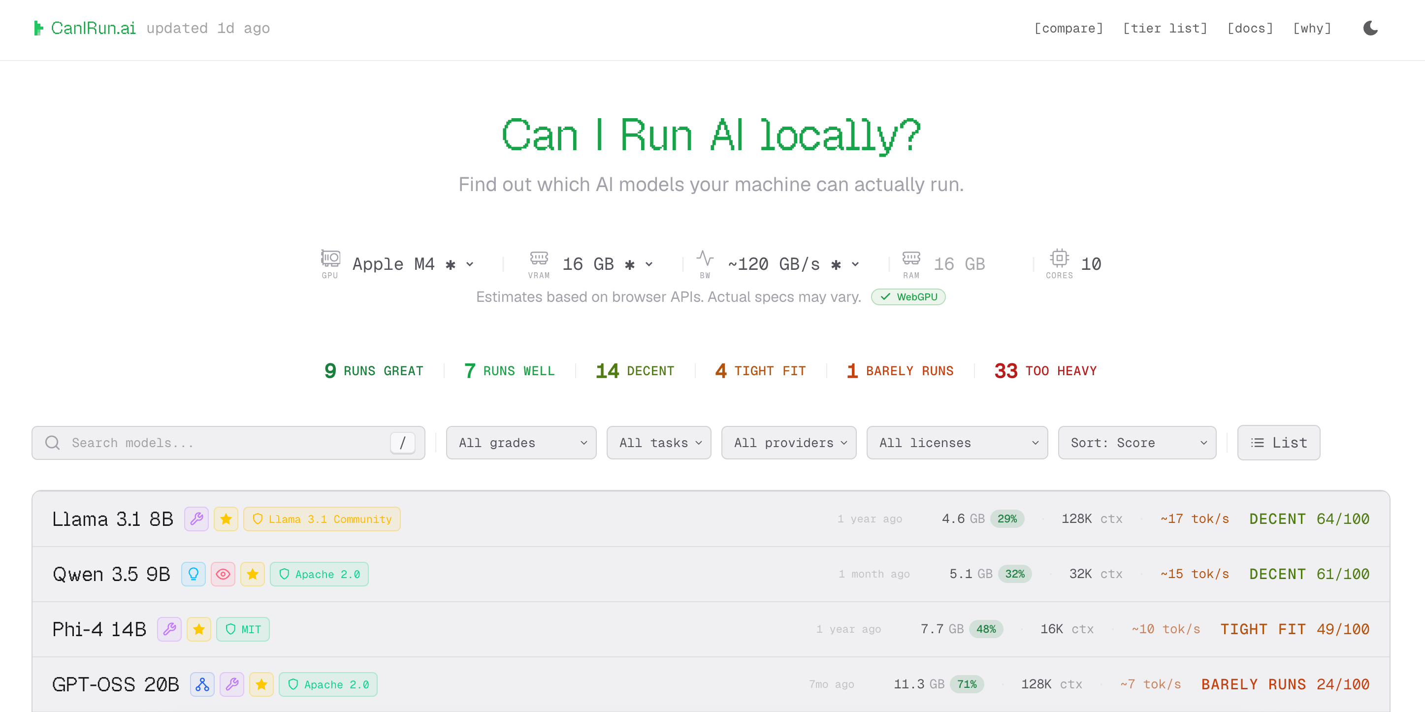 CanIRun是一个自动检测电脑硬件并推荐可本地运行大模型的网站,附带模型参数与安装下载信息。