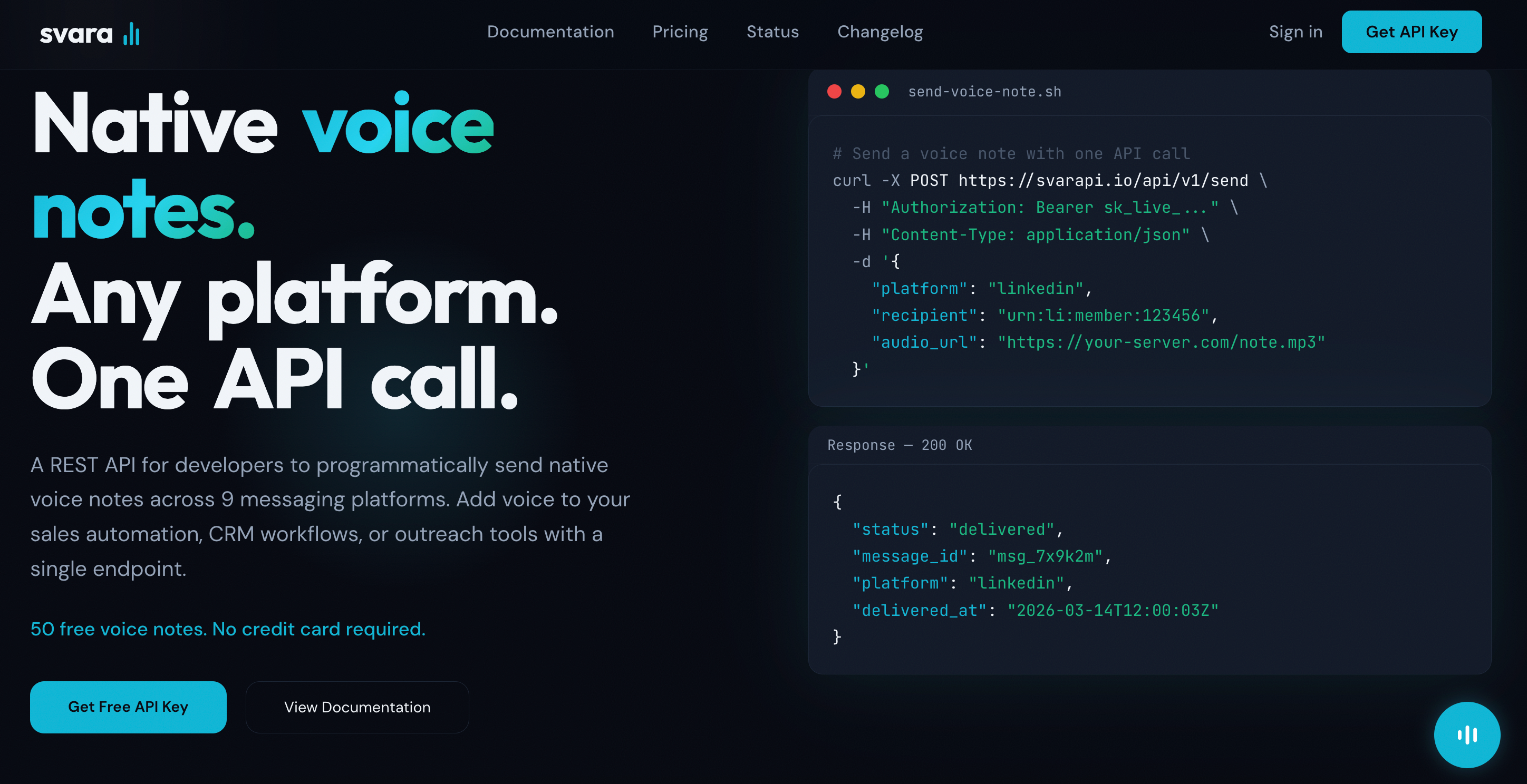 Svara是一个统一的语音消息发送API,可向9个平台发送原生语音消息并自动转换格式。