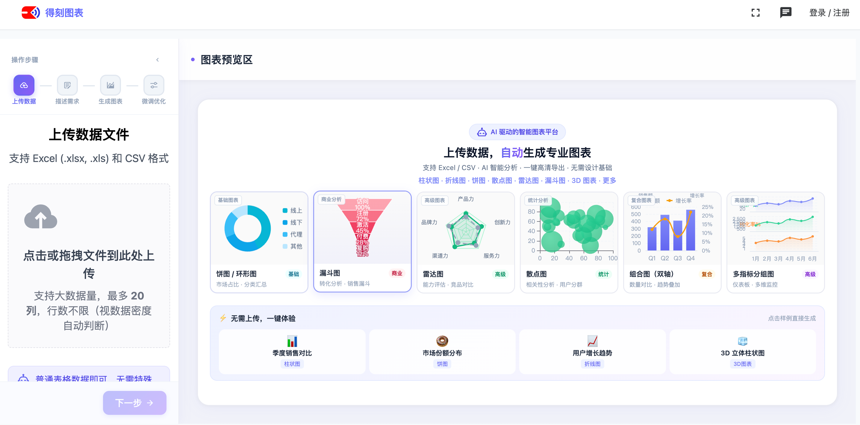 得刻图表是一个AI驱动的在线数据可视化工具,支持导入表格自动生成图表并深度编辑分享。