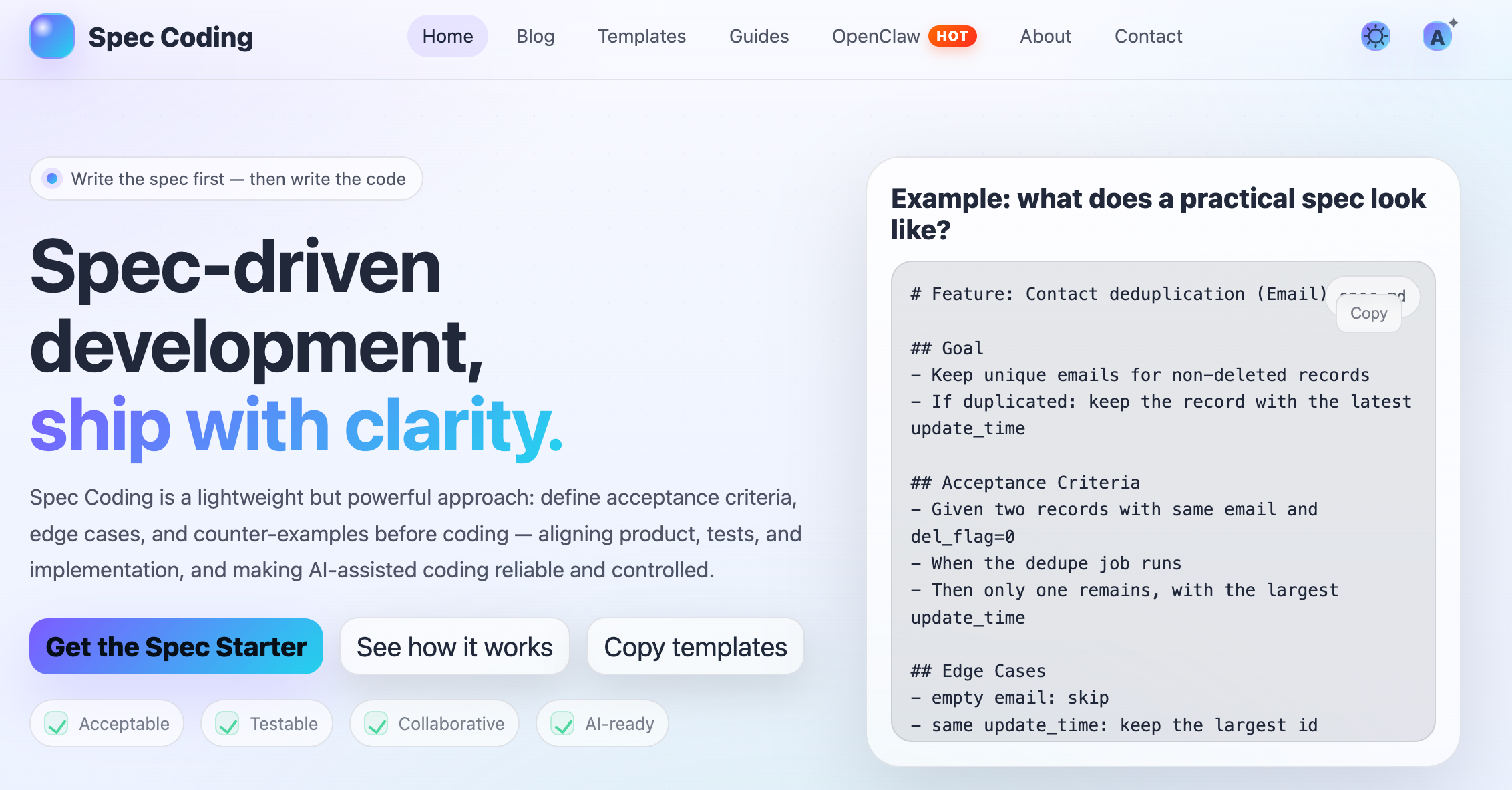 Spec Coding是一个Spec-first AI 编码网站,提供功能、API、数据库模板与基于规范的开发流程。