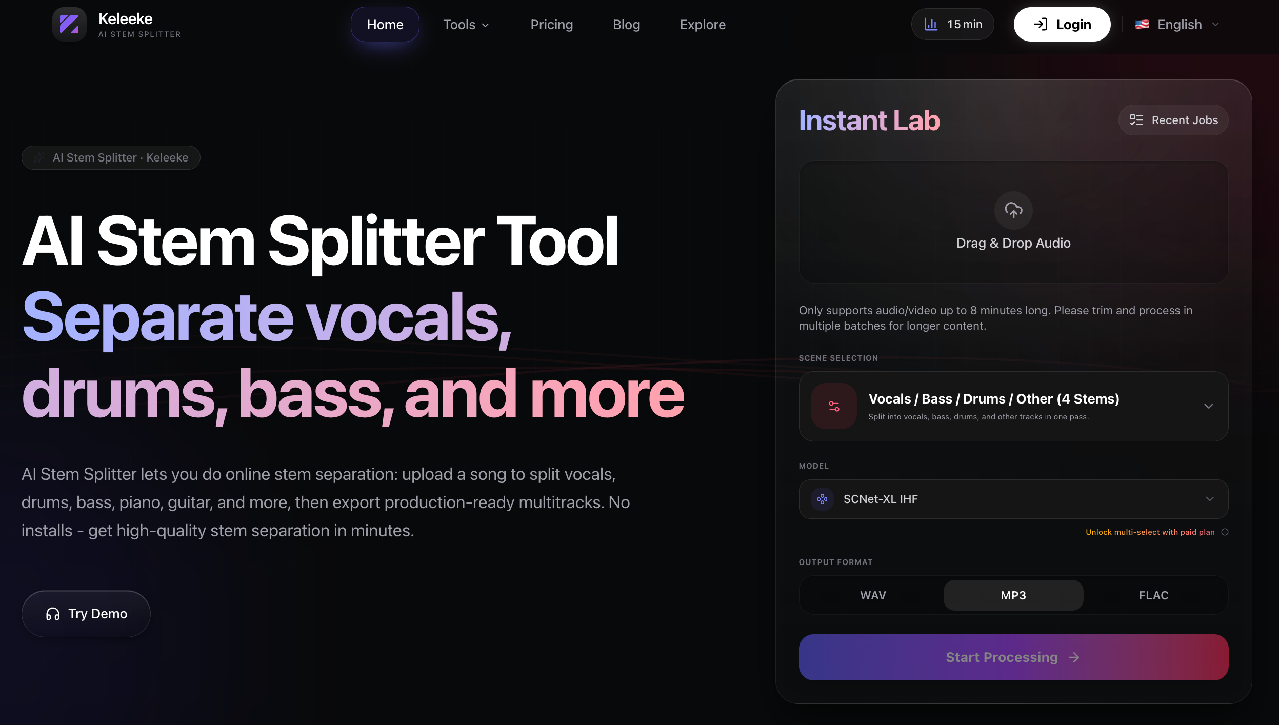Keleeke是一个在线AI音轨分离工具,支持多模型拆分人声与伴奏,并导出多种音频格式。