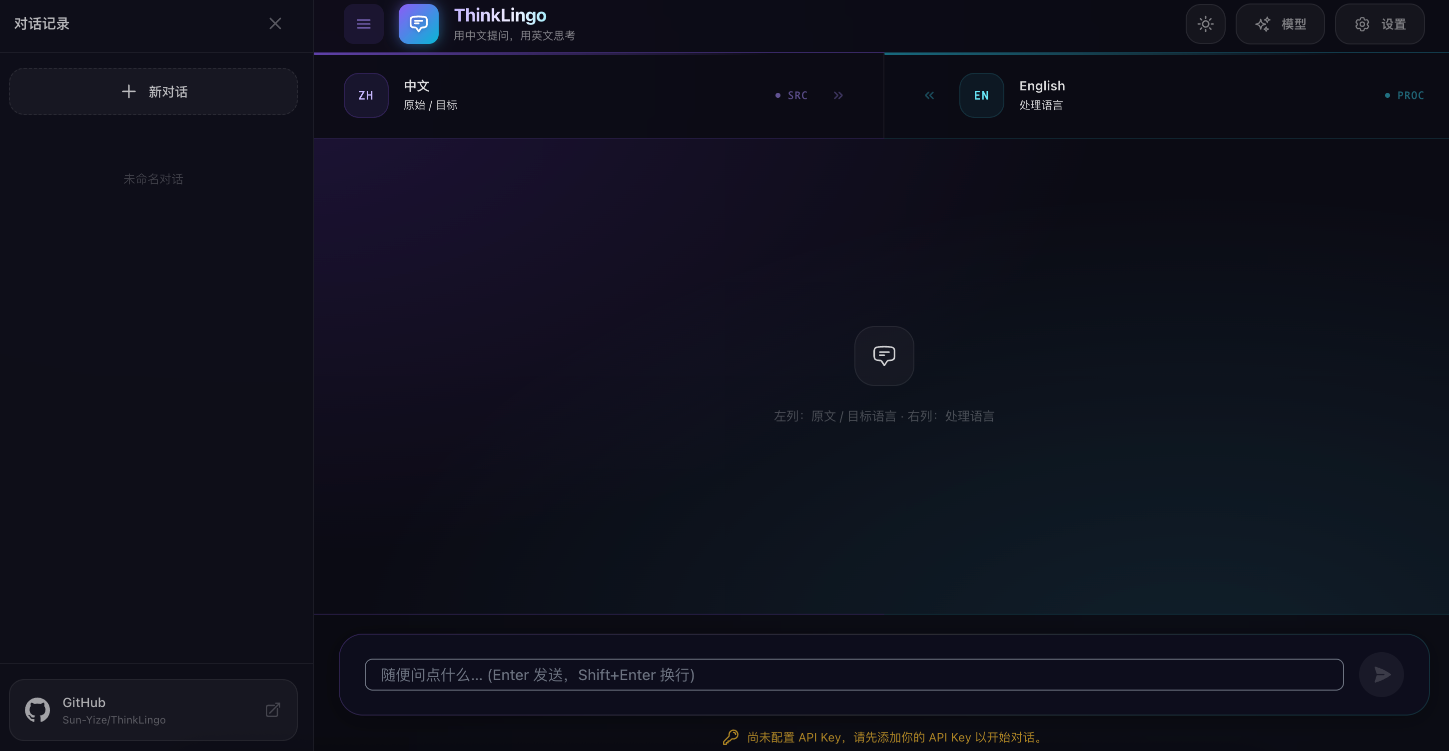 ThinkLingo是一款双核LLM应用,支持中文提问转英文深度推理并流式回译,兼顾质量与成本。