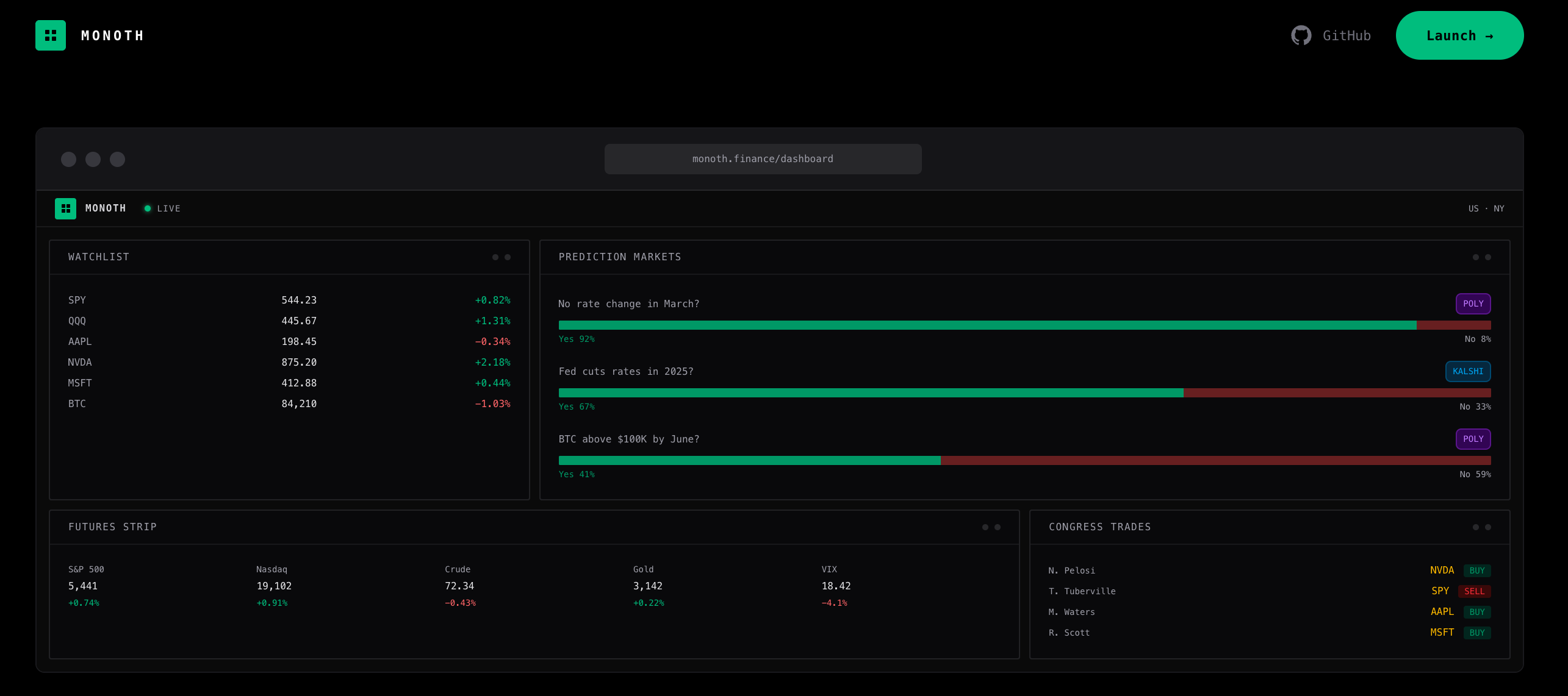 Monoth是一个开源实时市场仪表盘,聚合股票、加密、外汇与预测市场数据,支持自托管部署。