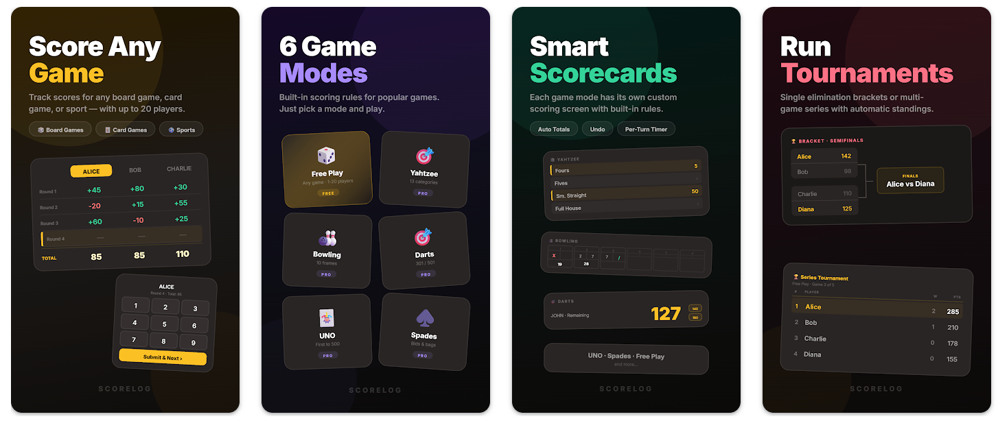 ScoreLog是一款安卓游戏夜记分应用,支持多种游戏规则、实时多人对战和联赛统计。