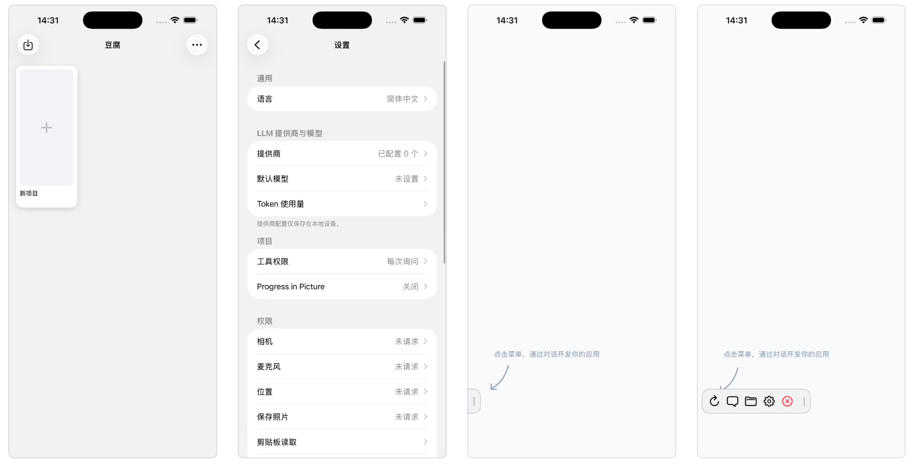 豆腐是一款在iPhone上可直接开发App的开源应用,内置多家LLM模型接口,通过容器运行本地HTML网站以会话方式开发,支持WebRTC和导出功能。