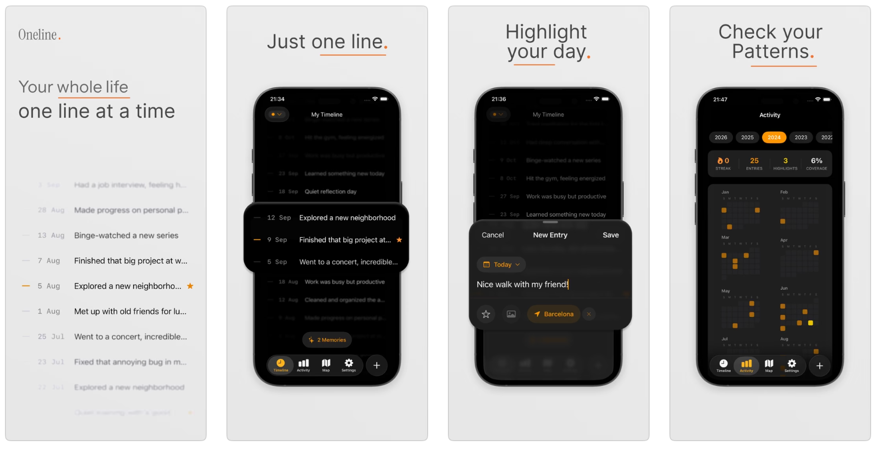 Oneline是一款独立开发的iOS一句日记应用,用于记录每日生活时间线,特点包括旋转时间轴触感、地图视图、iCloud同步、无需账户,支持Apple Intelligence。