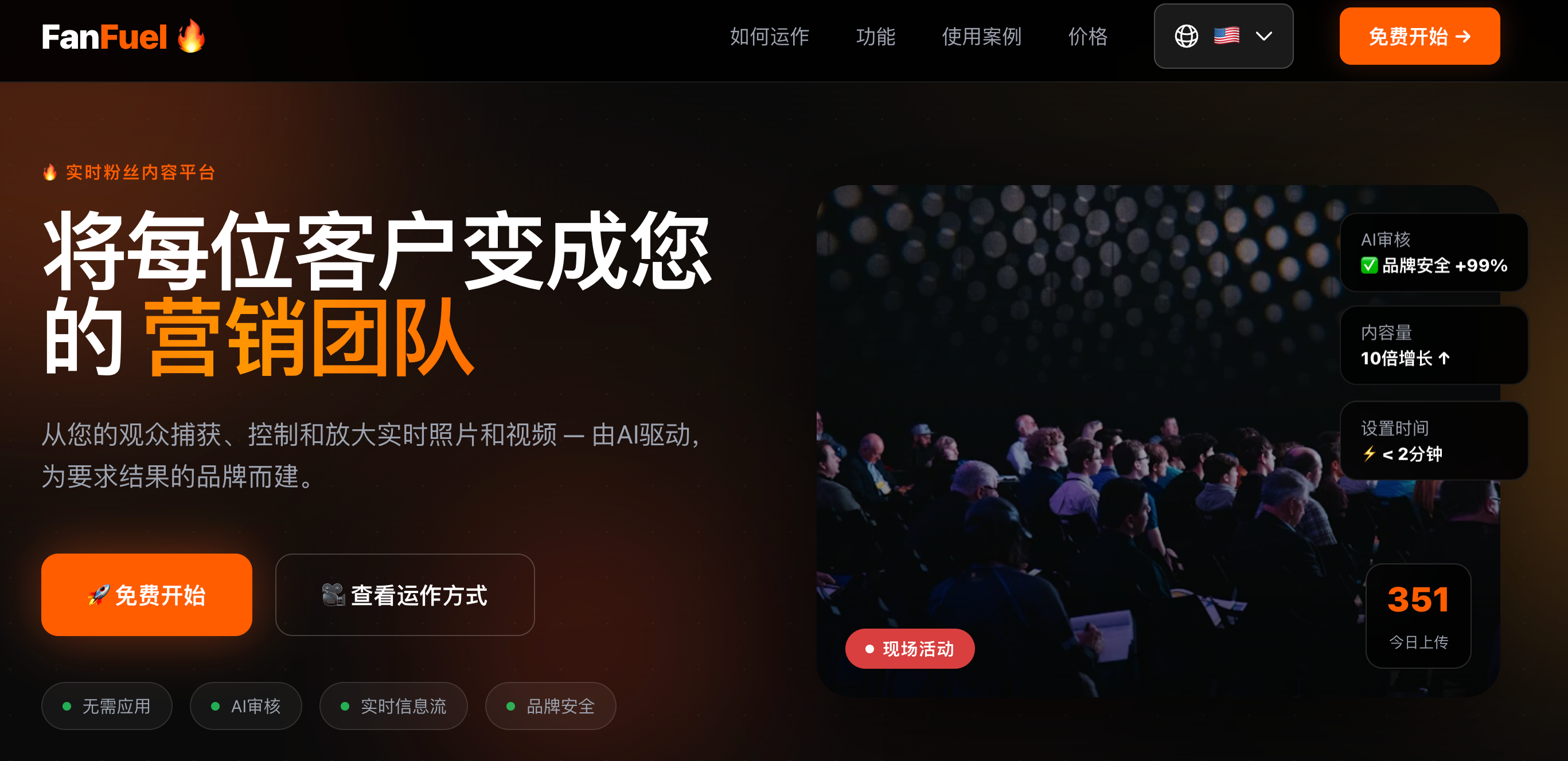 FanFuel是一个活动二维码上传工具,参会者扫码即可现场上传照片和视频,无需注册下载应用,支持地理围栏、AI内容审核、实时展示墙和Webhook自动发布。