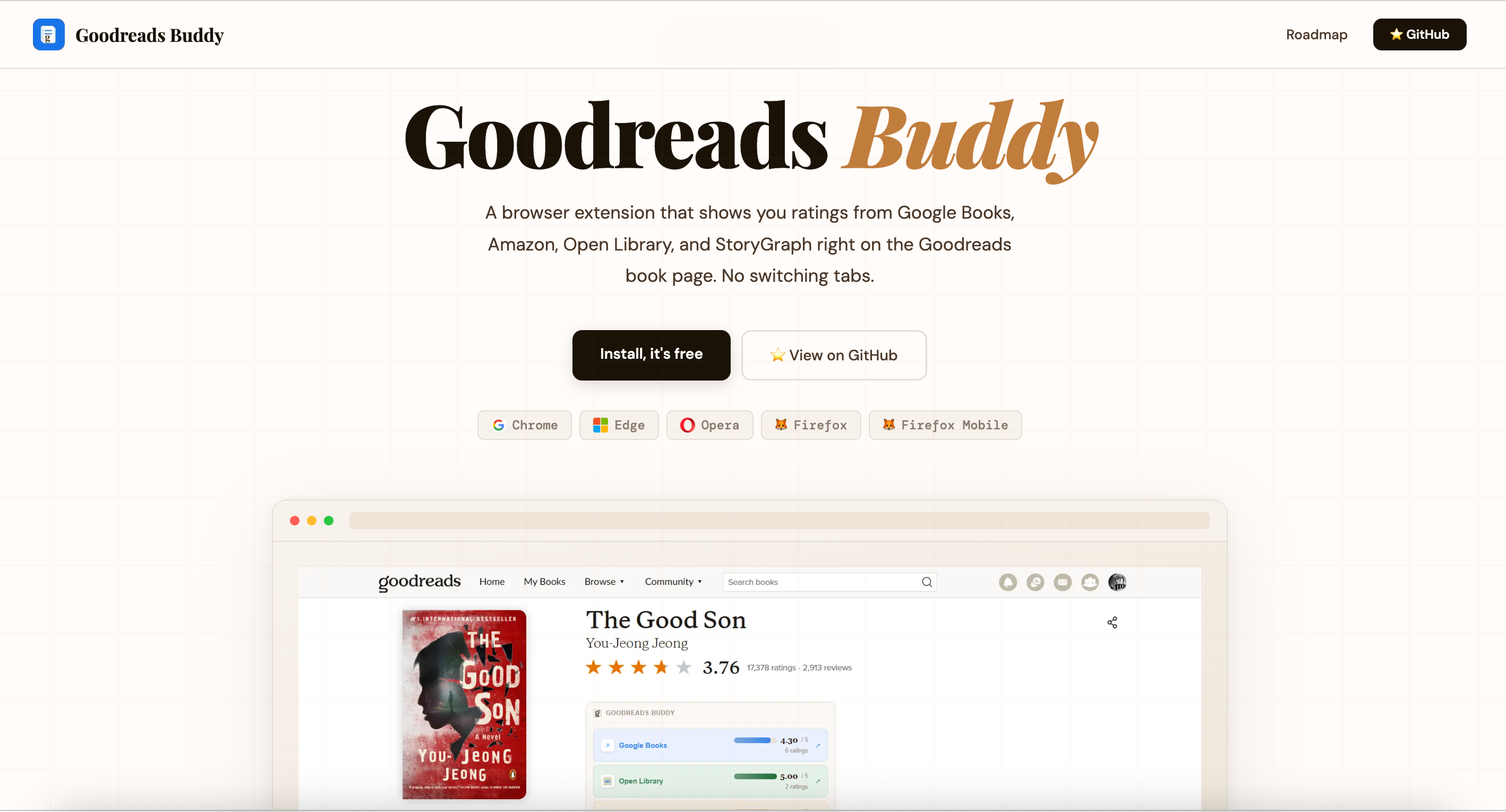 Goodreads Buddy是一款开源浏览器扩展,在Goodreads书籍页面直接显示来自Google Books、Amazon、Open Library和StoryGraph等平台的评分聚合。