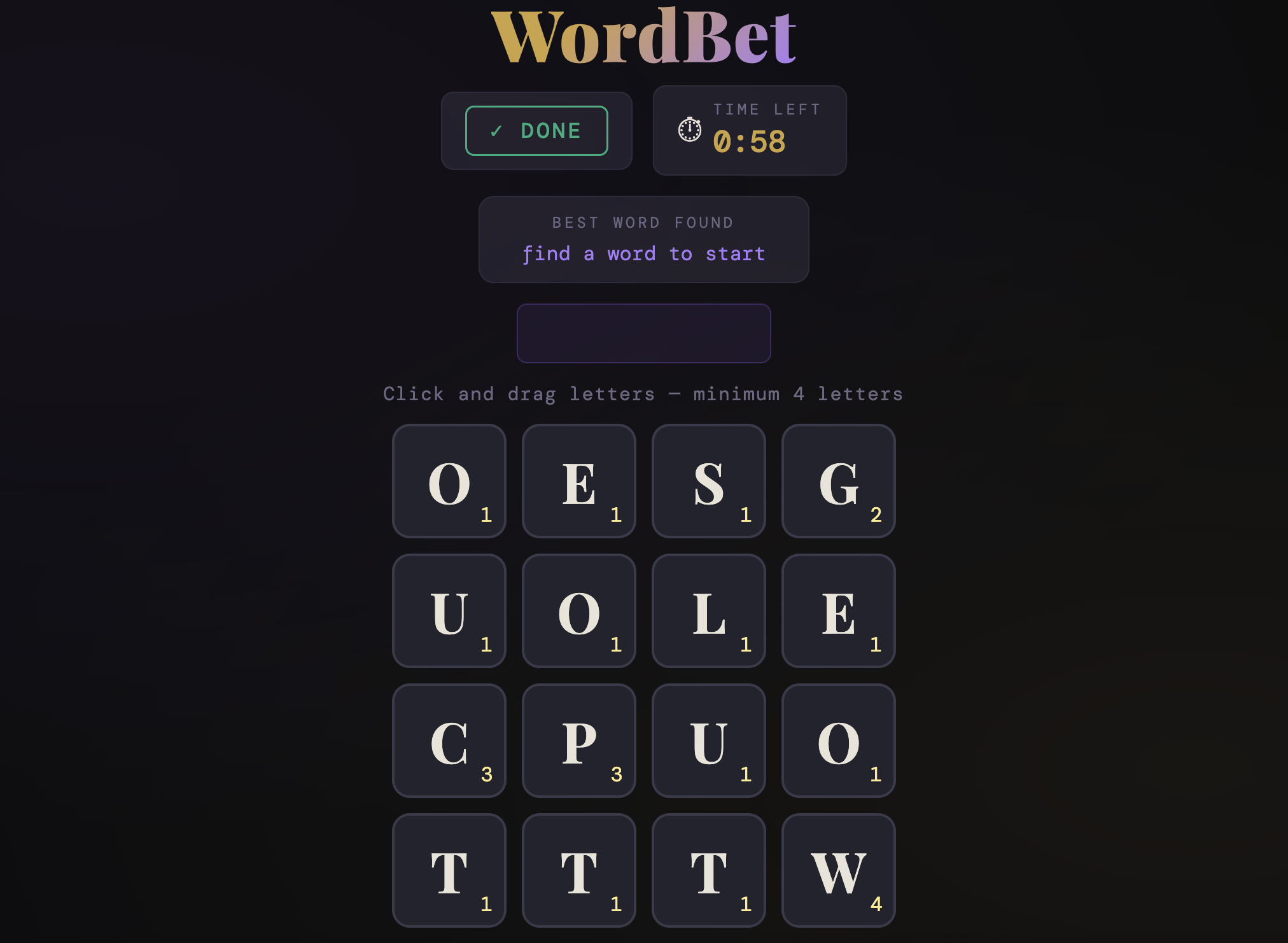 WordBet是一个在线字词游戏,在4x4字母矩阵中找词,回合结束后可对自己词的质量下注,支持免费试玩。