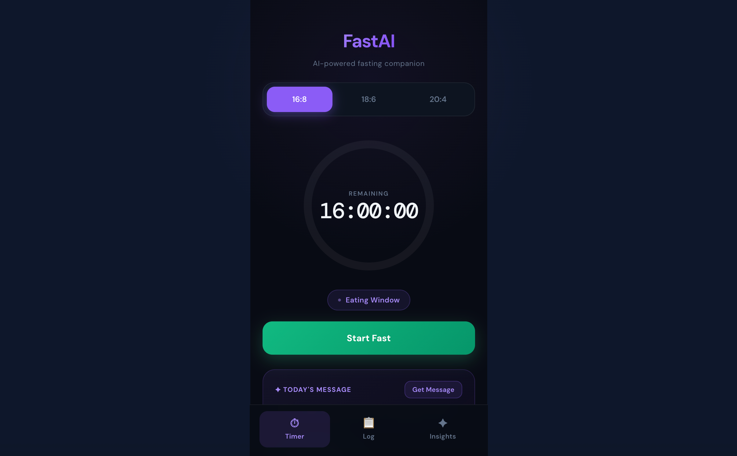FastAI是一个由Claude AI驱动的间歇性禁食应用,支持16:8/18:6/20:4计时器、餐食记录、AI个性化建议和饮水追踪,无广告且免费。
