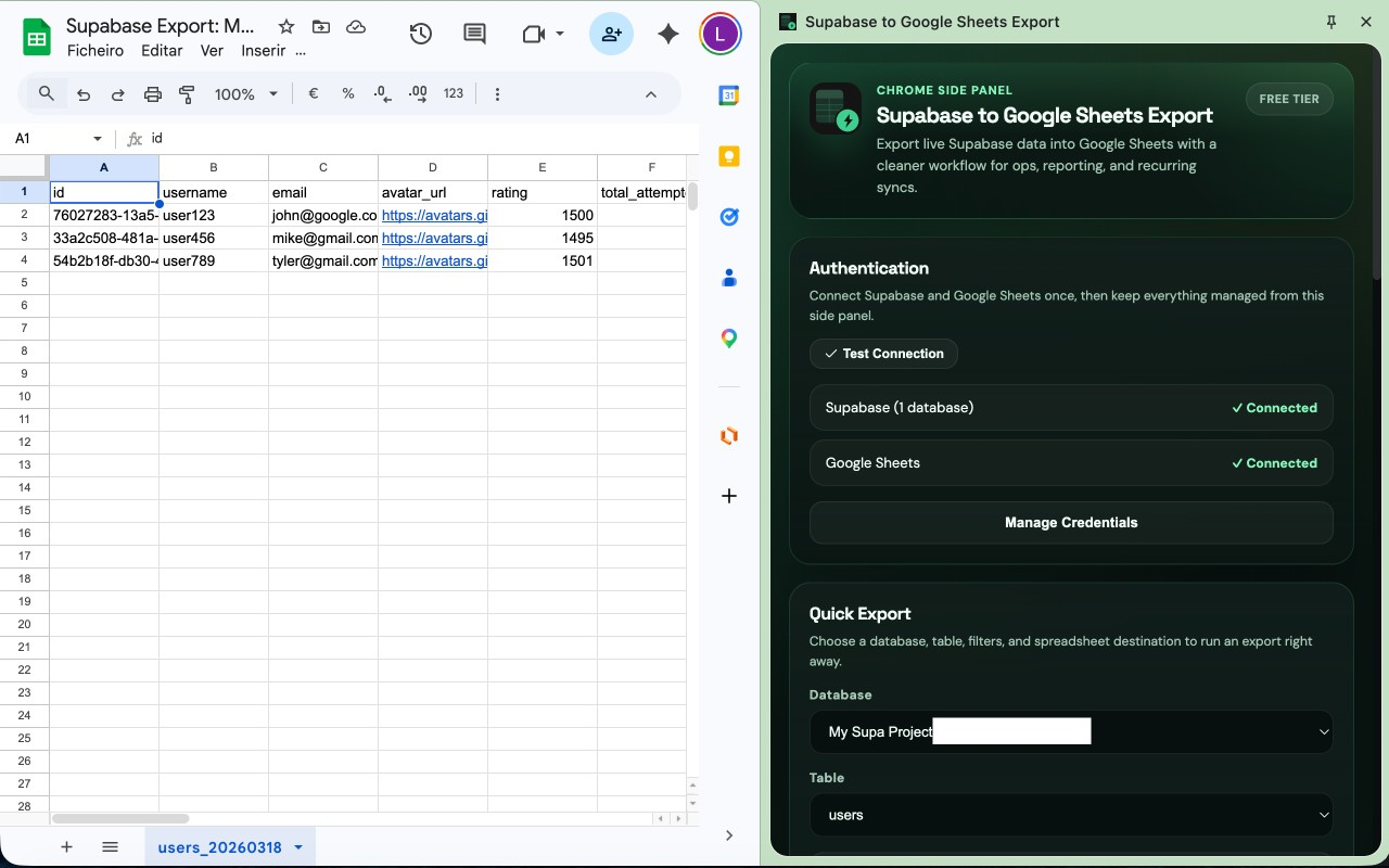 Supabase to Google Sheets是一个Chrome扩展,可一键将Supabase表数据导出到Google Sheets,免费版支持500行,Pro版支持10k行、定时同步和过滤功能。