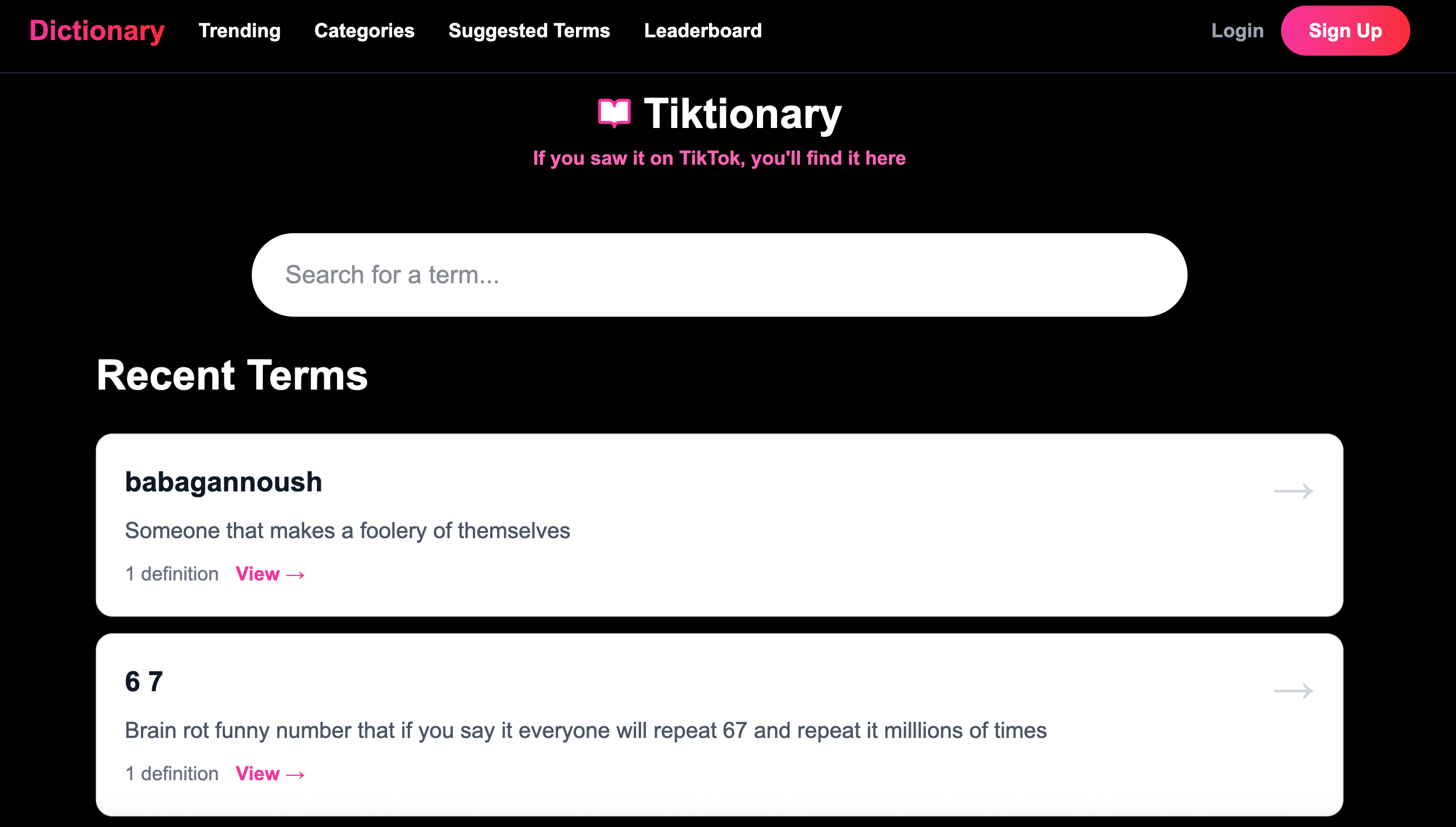 Tiktionary是一个TikTok社区词典网站,用户可以提交流行语定义、附加视频示例、投票评分,支持趋势页查看热门词条。