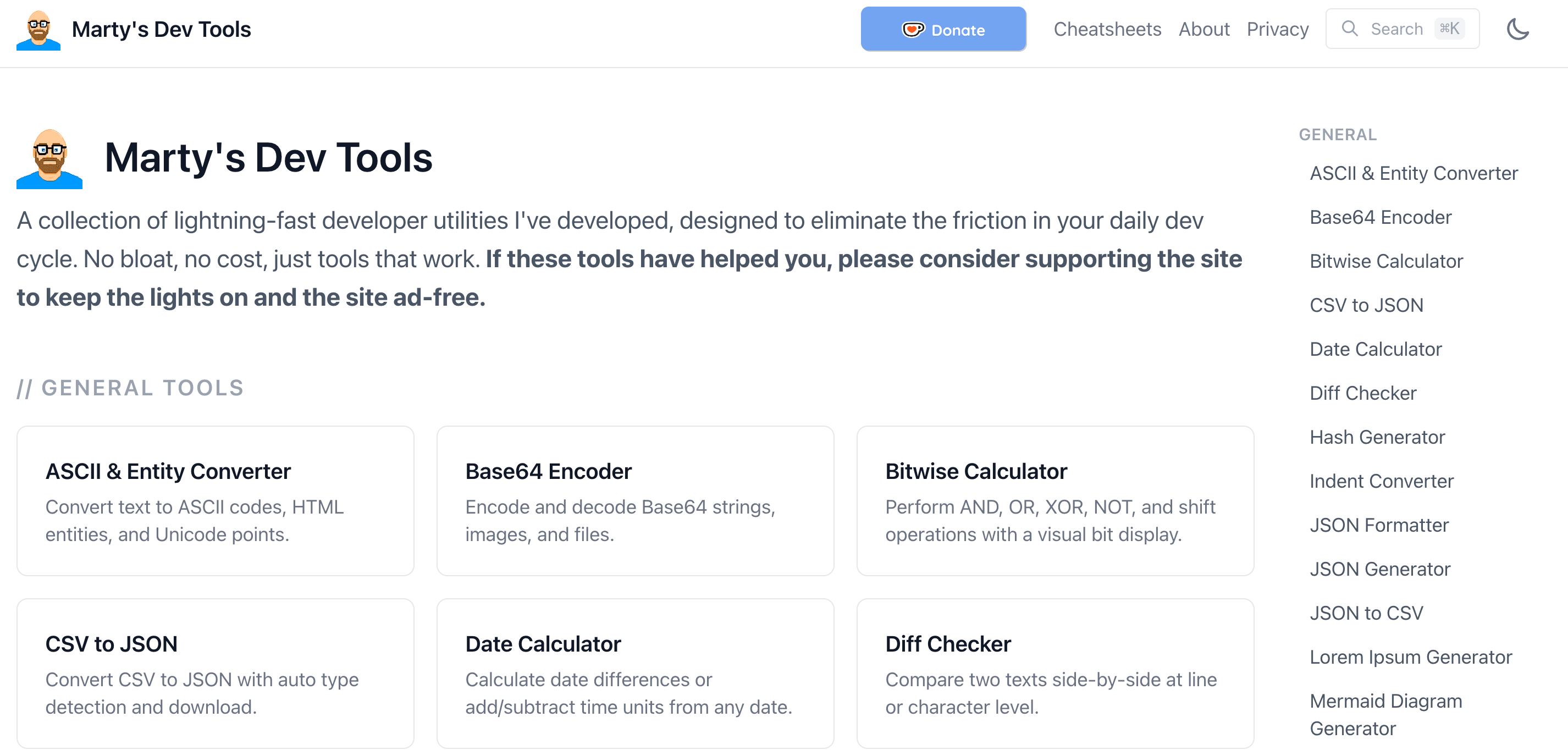 Marty’s Developer Tools是一个无广告、无需注册的在线开发者工具集合,包含JSON格式化、正则测试、Cron构建等实用功能。