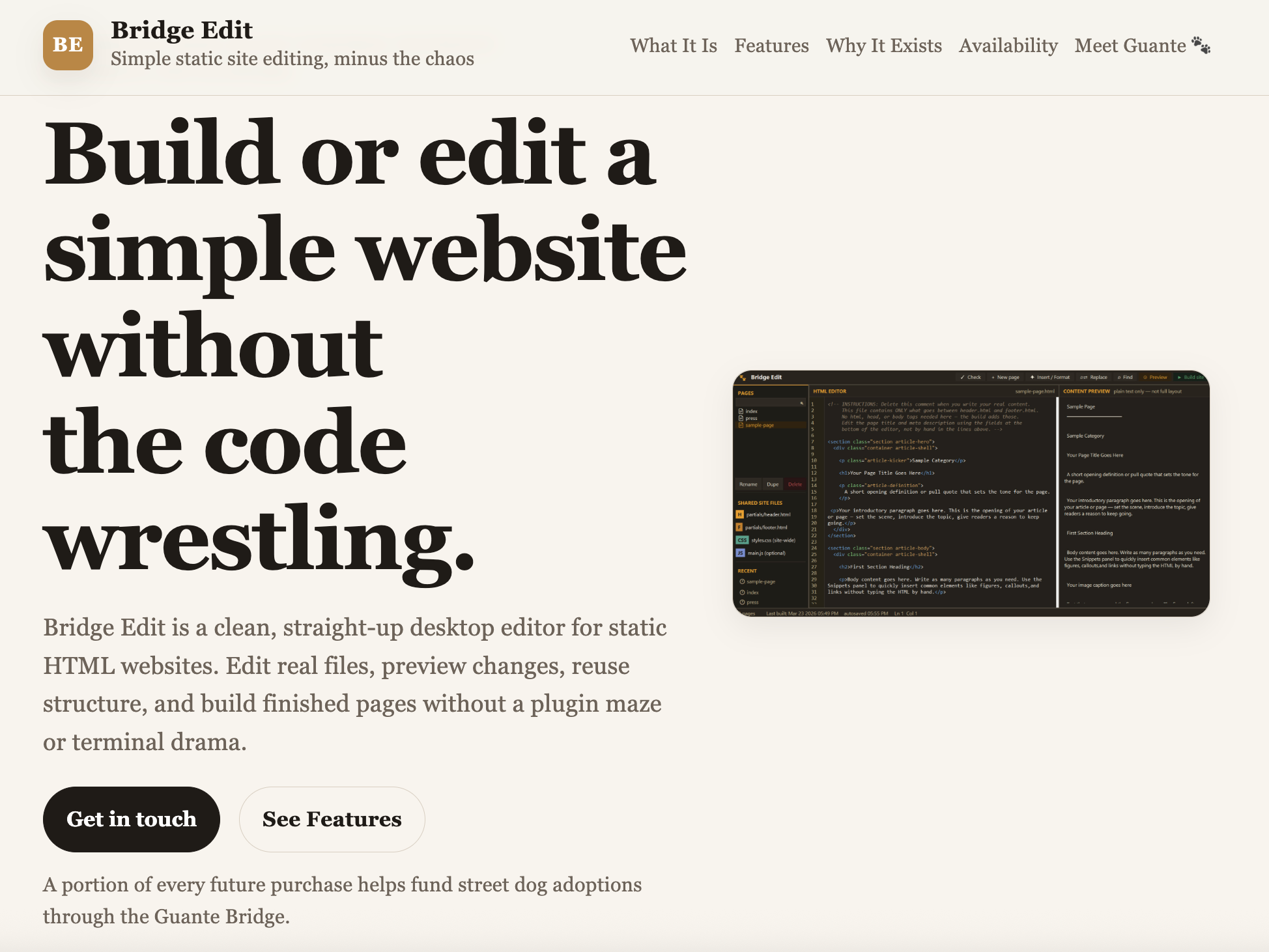 BridgeEditor是一款简洁的静态HTML编辑器与网站生成器,专为无需复杂平台的侧项目设计,提供基础功能支持。