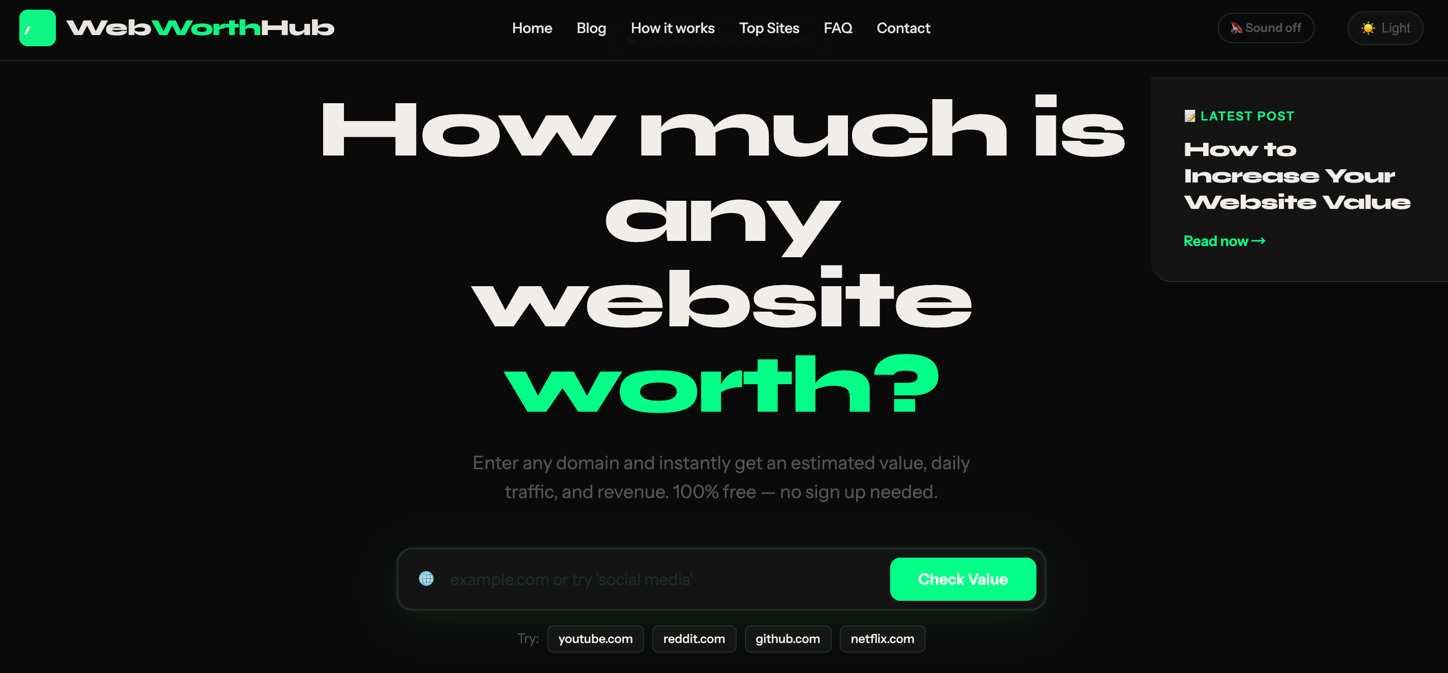 WebworthHub是一个免费的网站估值工具,输入域名即可获取估值、日流量与收入估算,并配有音效和动画反馈。