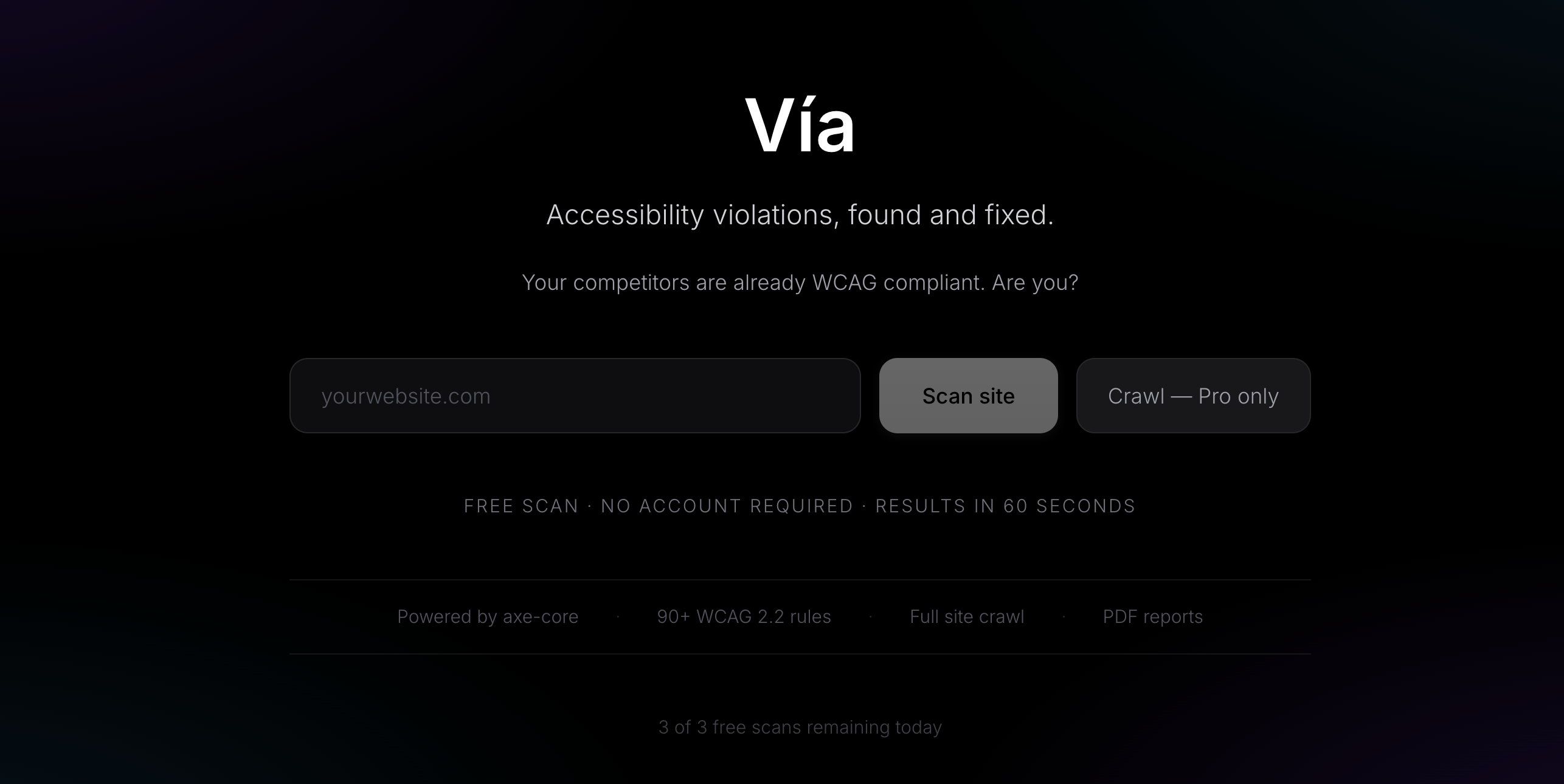 viascan是一个专注于检测WCAG 2.2无障碍违规并提供修复代码的网站,帮助开发者快速定位和解决网页可访问性问题。