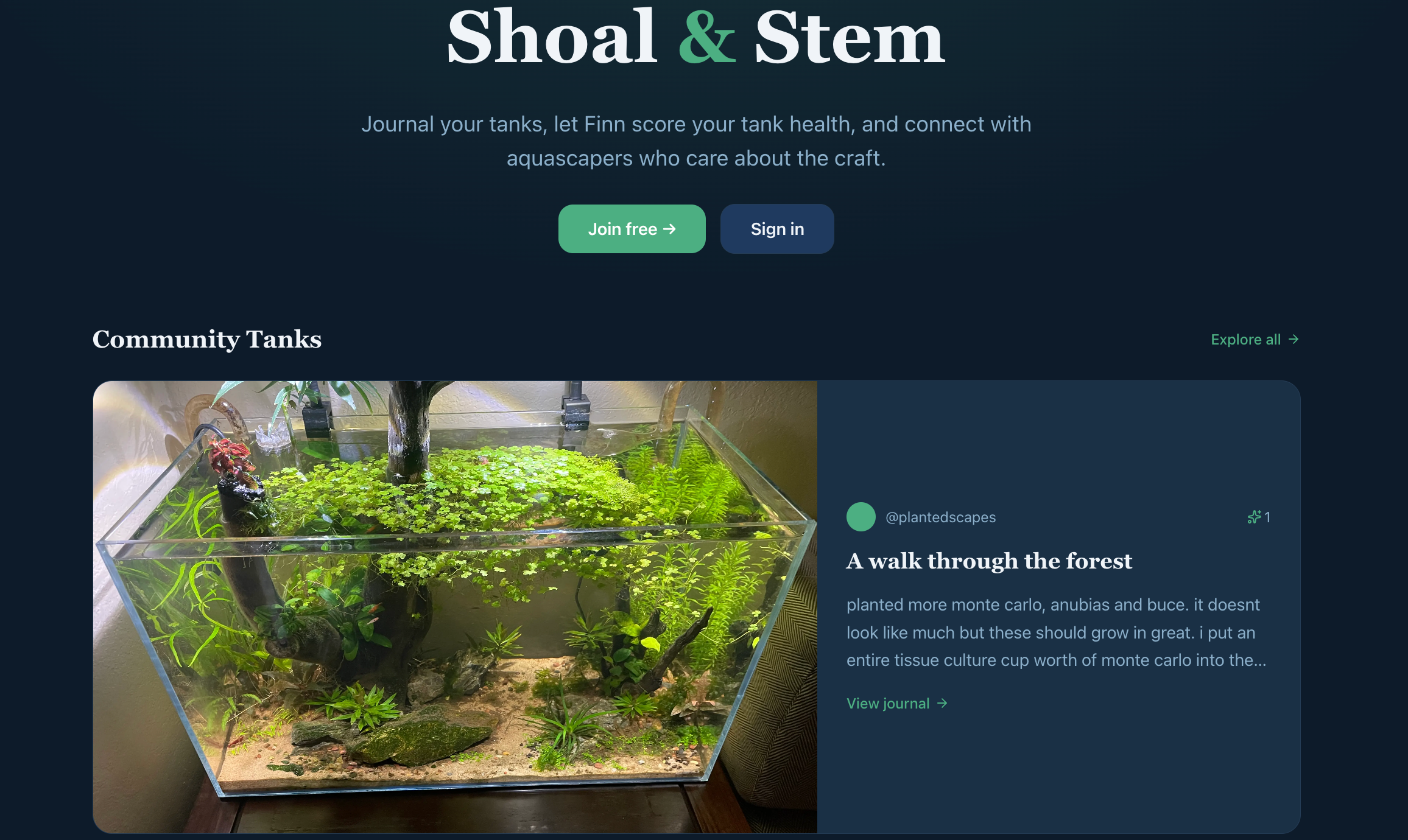 Shoal and Stem是一款专为水族与水草造景爱好者设计的社区平台,提供水箱档案、健康评分与AI助手功能。