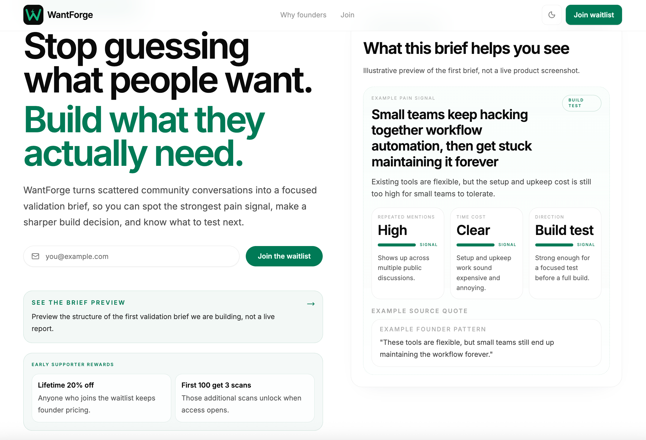 WantForge是一款面向独立开发者和出海SaaS的AI需求验证工具,自动分析市场痛点与需求强度,生成落地页文案与调研问题。