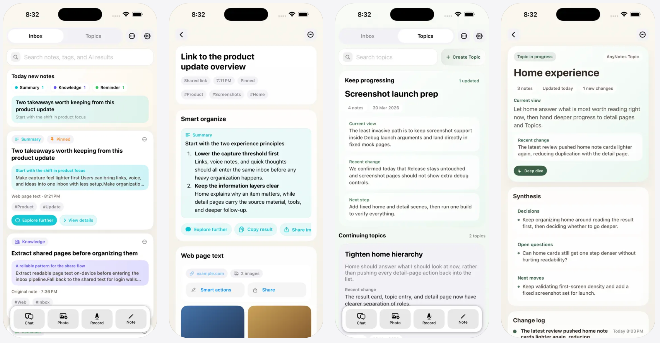 AnyNotes+是一款支持AI智能处理的iOS笔记应用,可实现录音转写、图片OCR、网页分享及自动摘要生成。