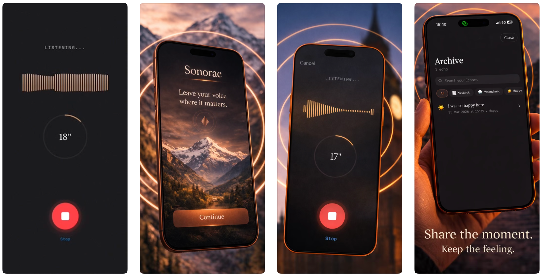 Sonorae是一款面向旅行者的iOS应用,支持在指定GPS坐标录制20秒语音,回访时静默提醒并提供时间胶囊模式。