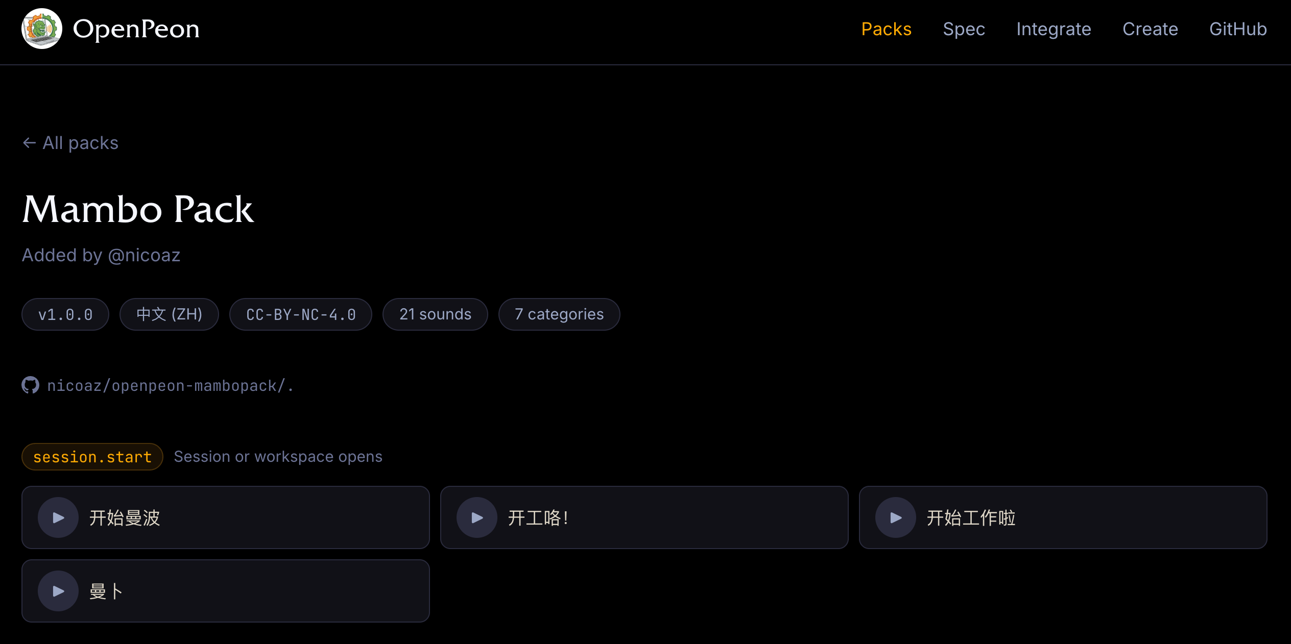 mambo_pack是一个为peon-ping设计的曼波风格语音包,可替换提示音,支持命令行安装与切换。