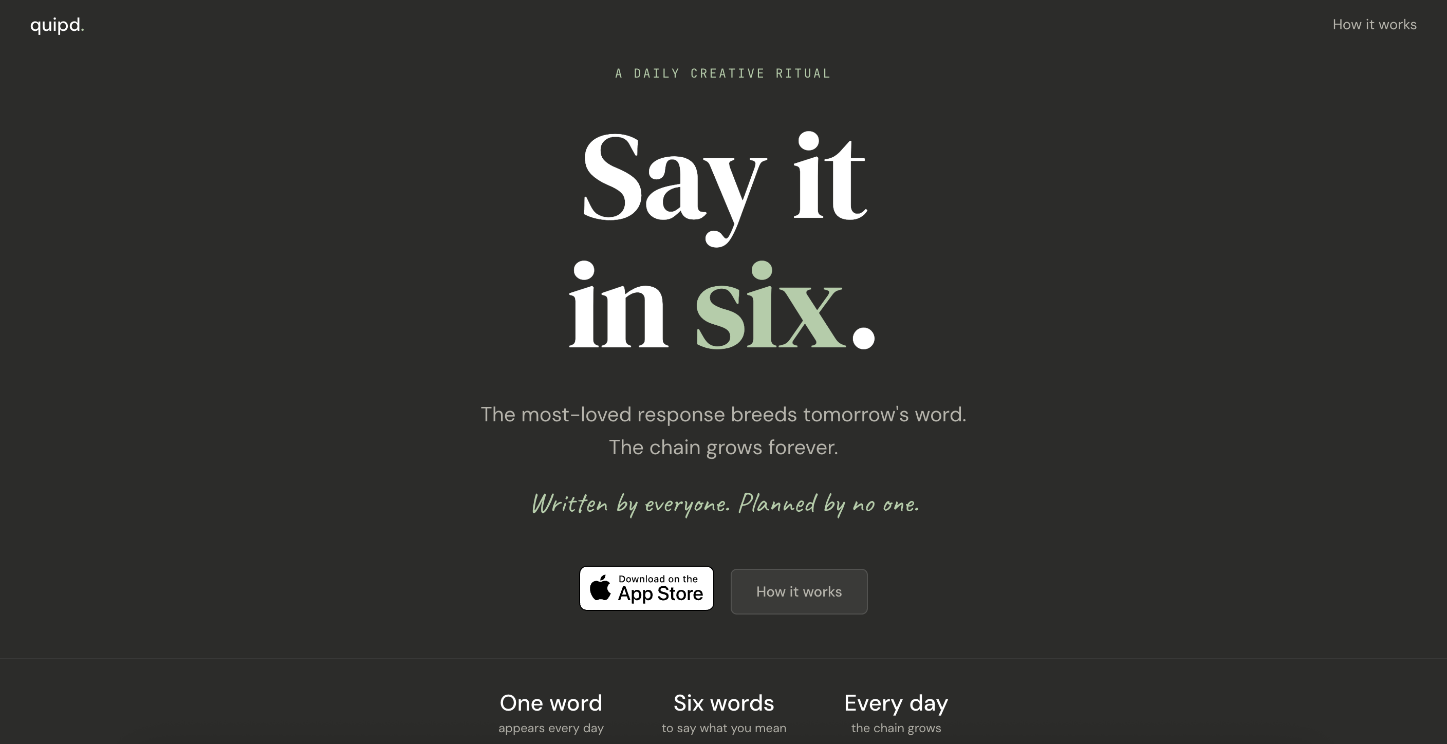 Quipd是一款离线优先的多用户iOS应用,每日发布一个词,用户用该词写六字并投票,48小时后自动删除。