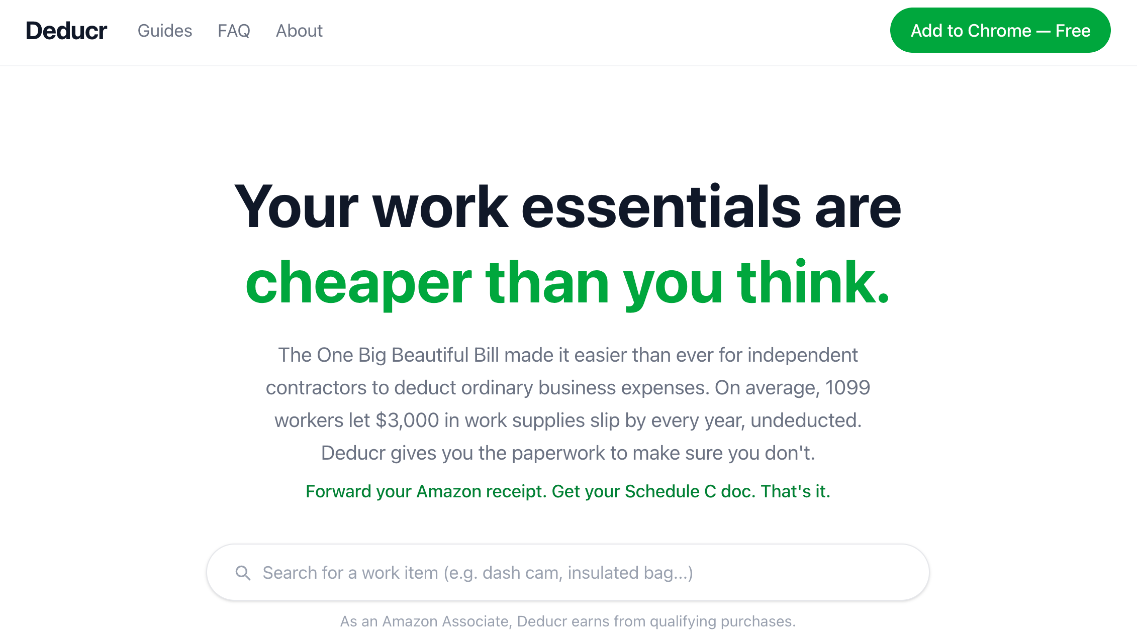 Deducr是一款免费税务工具,可在亚马逊页面实时显示可抵扣成本,并支持通过邮件获取Schedule C参考PDF。