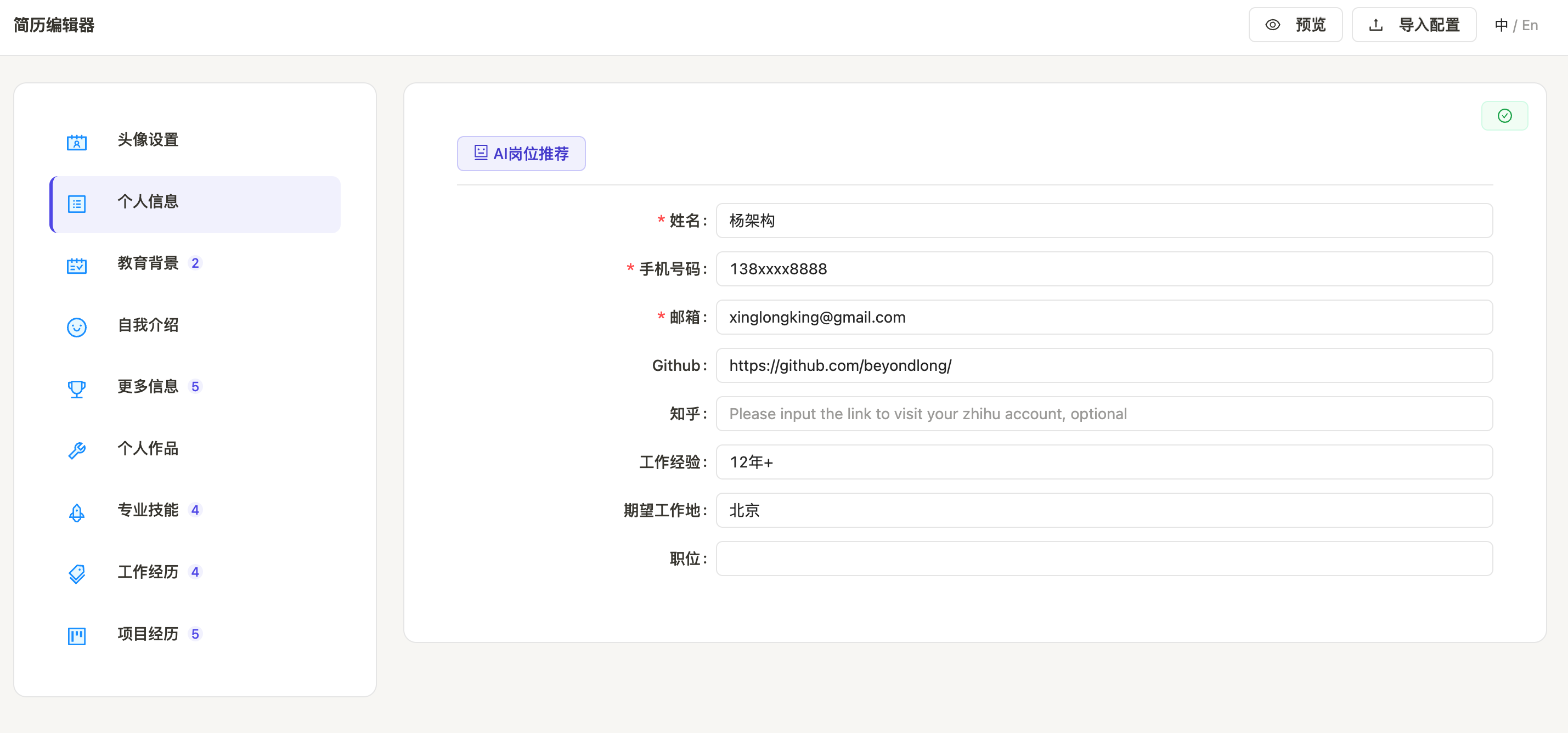 resume-builder是一款开源在线简历编辑器,支持5套模板、JSON配置驱动和PDF导出。