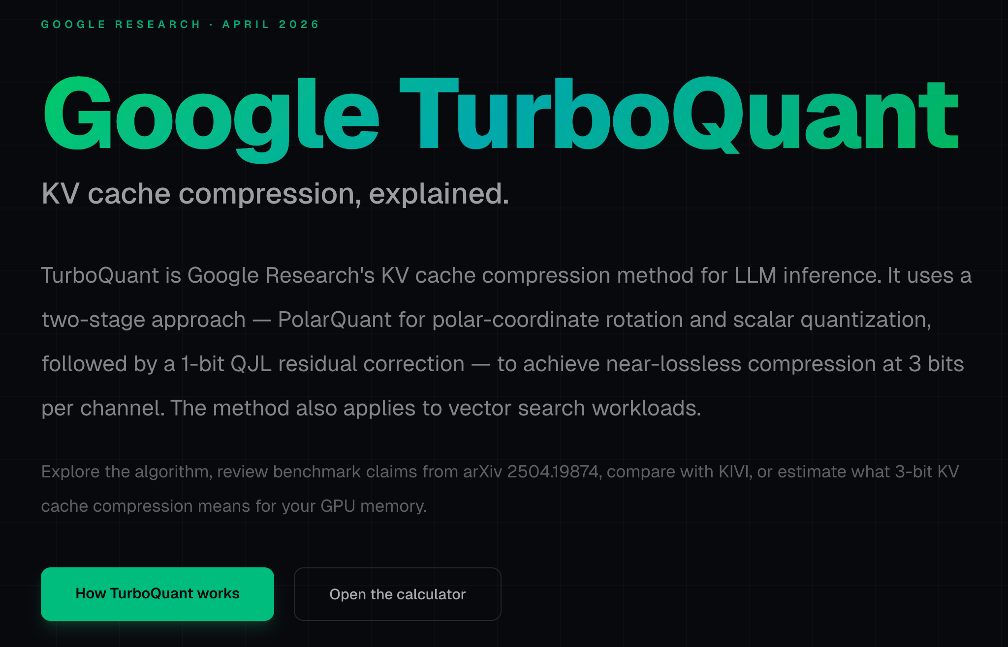 TurboQuant 小工具站是一个基于论文的量化工具网站,提供显存计算器与方法对比分析,支持 Llama 3.1、Mistral 等模型的 KV cache 3-bit 量化计算。