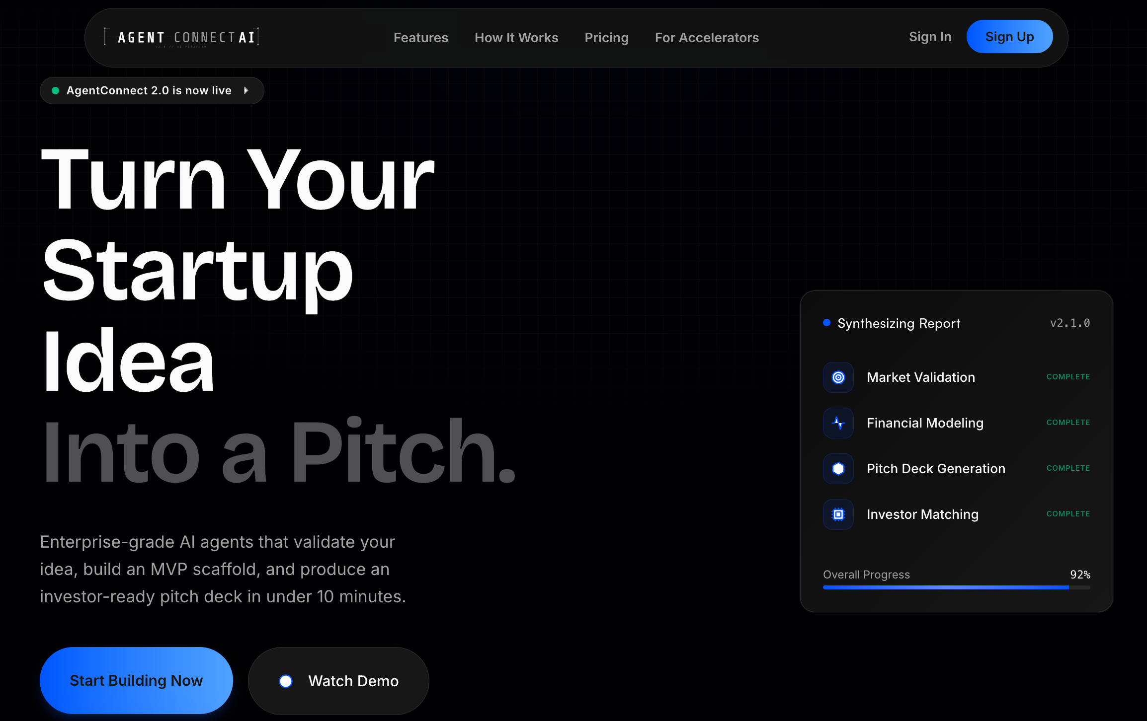 AgentConnect是一款AI创业工具原型网站,可将创意转化为需求验证、MVP骨架及投融资PPT报告。
