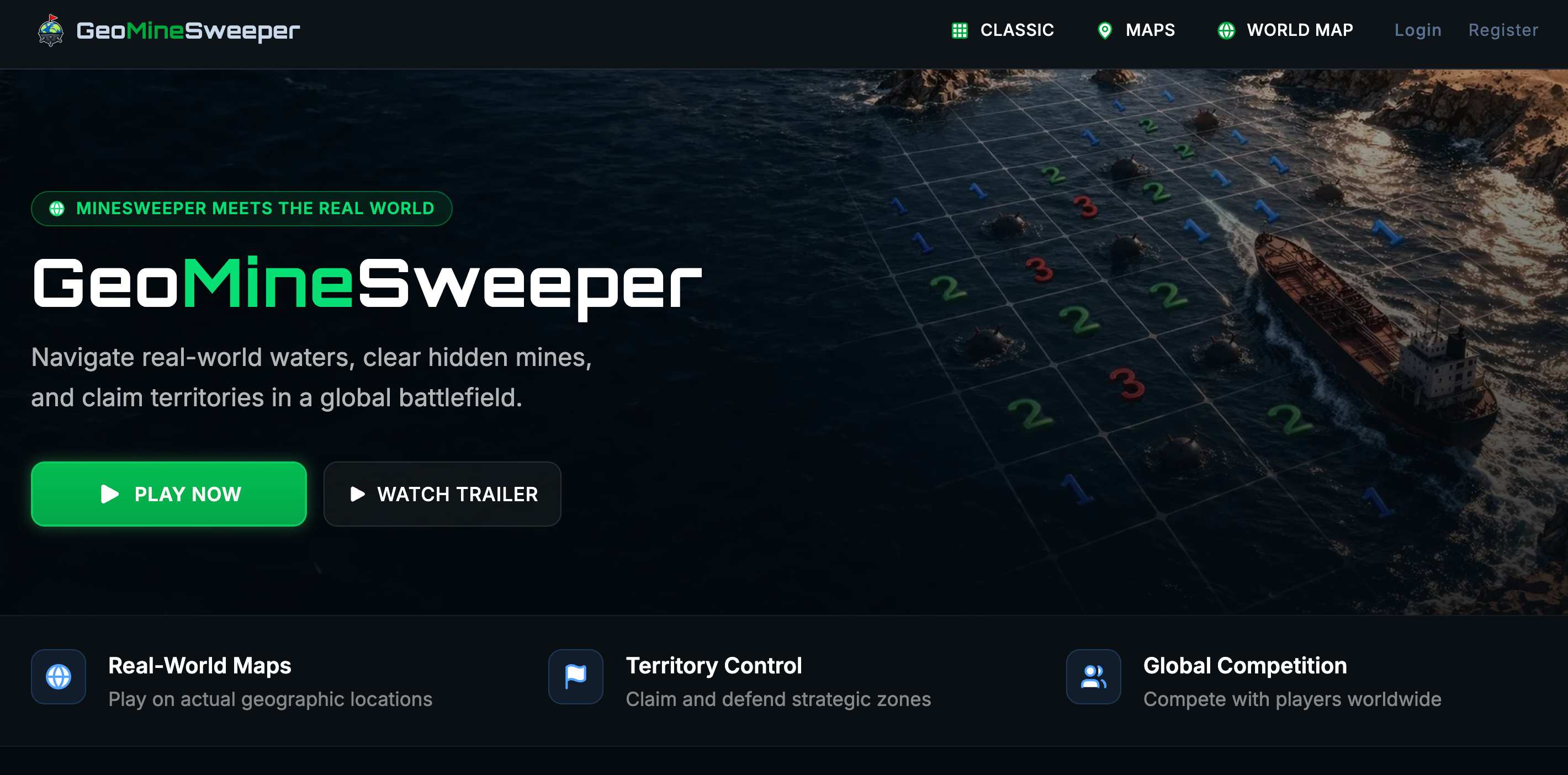 GeoMinesweeper是一款在真实世界地图上玩的扫雷网页游戏,支持复活功能和移动端,融合地理探索与经典玩法。